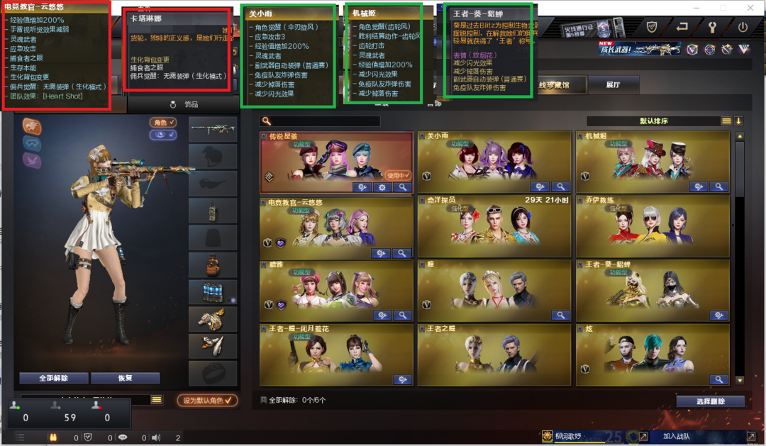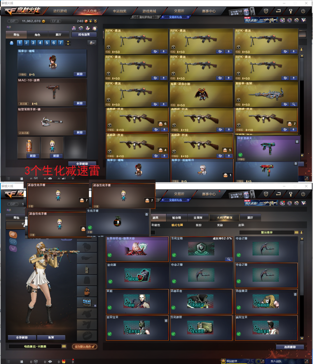 装备描述:排位:可以、、、、、、、生化四防(生化背包、查看僵尸血量):无需换弹:6盘6烈、炼狱、异变清道夫、斯泰尔枪娘、斯太尔蝴蝶、死亡之眼、MAC-涂鸦、手斧镜、4个生化减速雷、超级对讲机、全部弹匣、、、、、、、爆破四防:幻神(纸灯笼皮肤)、M200-竞技荣光、王者星神、传说灵眸、、、、传说破晓、传说辉光、、白虎、QBZ蔷薇、王者芳薇、、、、雷神音效、黑骑士音效、、、生化四防(云悠悠、卡塔琳娜)、爆破四防(关小雨、王者貂蝉、晴雅)