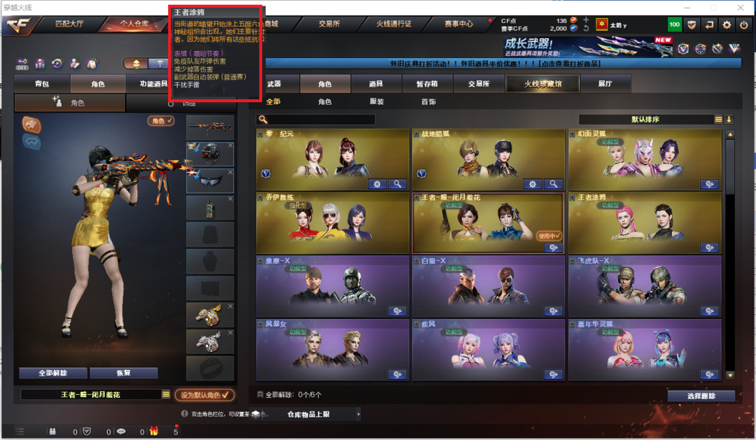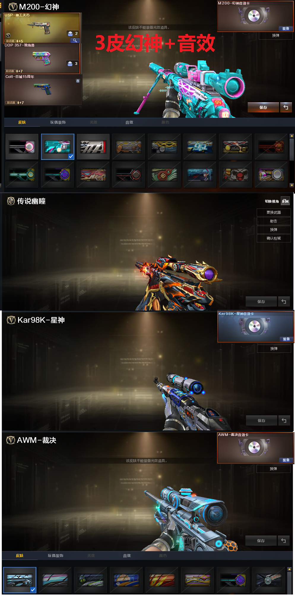 装备描述:排位:可以、、、、、、、、爆破四防:幻神3皮肤+音效、传说幽瞳、98K星神、、、、、USP神工天巧、QBZ金色蔷薇、、、幻神音效、裁决音效、星神音效、毁灭音效、、、1套雷暴、5套神工天巧、、、爆破四防(王者涂鸦)