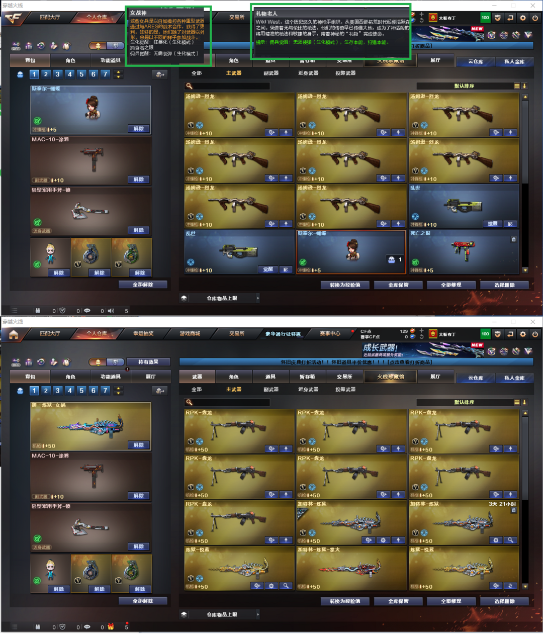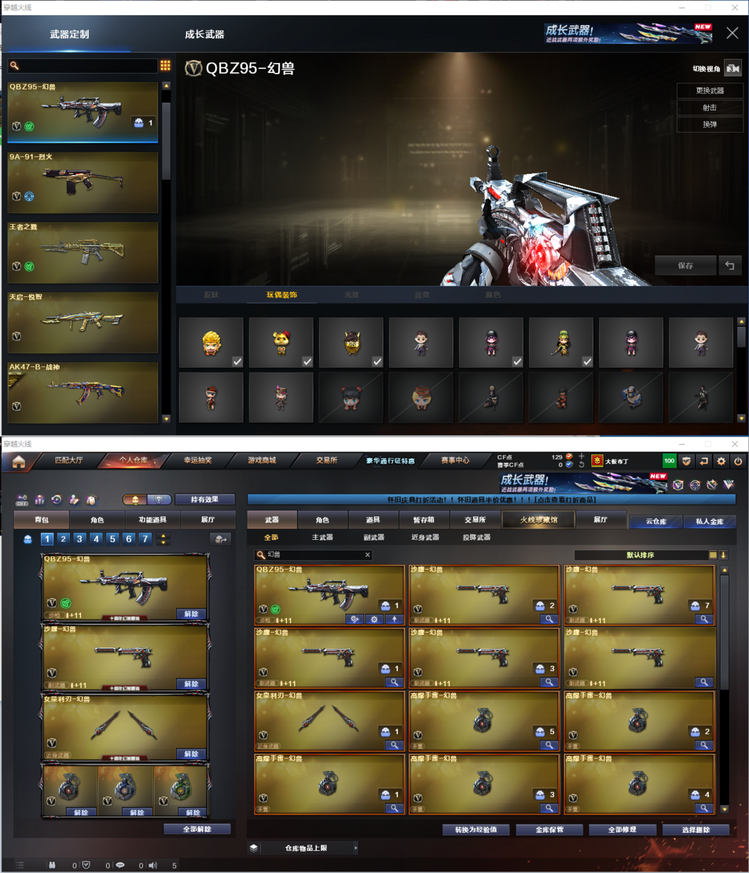 限制: 租号2次及以上 |装备描述:排位:可以------------生化全装(更换背包、可以查看生化僵尸血量):无需换弹、6盘6烈、斯太尔蝴蝶、死亡之眼、MAC-涂鸦、手斧镜、生化减速雷、超级对讲机、全部弹匣、、、、、、、、爆破全装:幻神音效(丹凤皮肤)、98K星神、、、、、USP雷暴、COP雷霆、破空枪刃、5个幻兽沙鹰、加利尔ACE-天袭、QBZ幻兽、QBZ天罚、VSK-94-金蚀、、、幻神音效、裁决音效、雷神音效、毁灭音效、天罚音效、火麒麟音效、、、5套幻兽、8套雷霆、6套雷暴、、、生化人物(礼物老人、女战神)爆破人物(蝴蝶)
