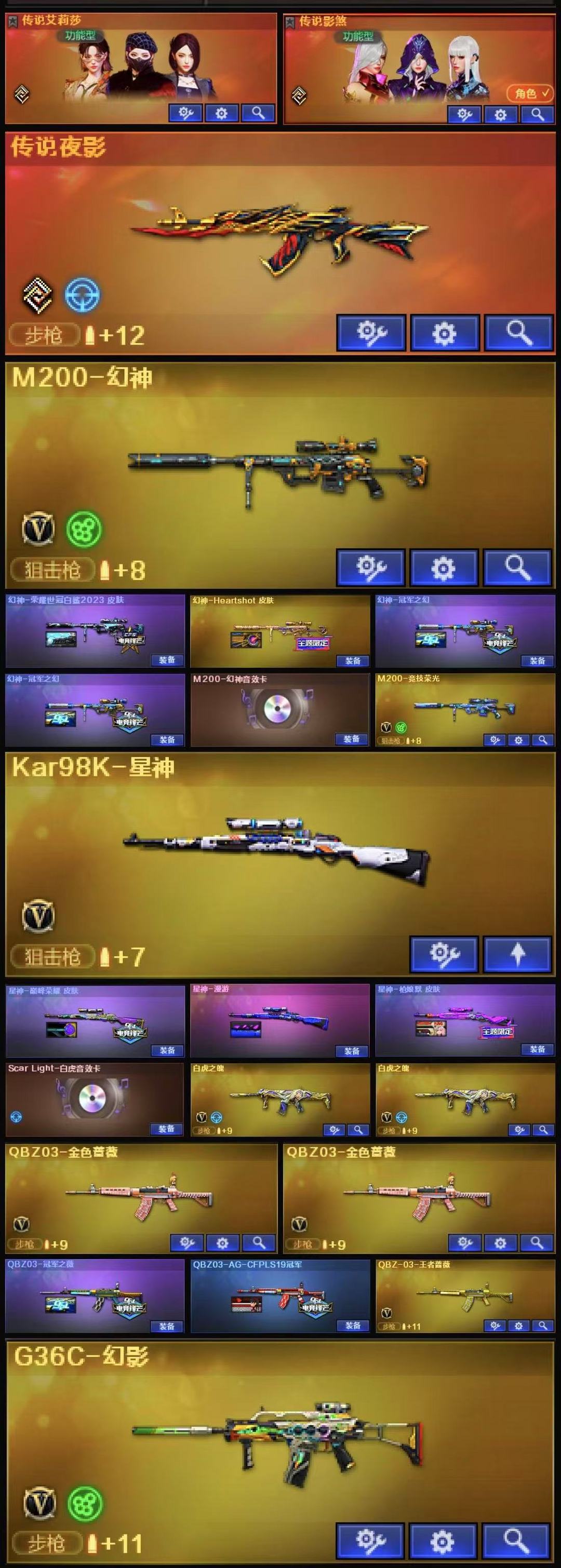 4防传说艾莉莎影夜影+4皮幻神音效卡+3皮星神G36C幻影白虎之魄冠军之薇+6柯尔特手枪双皮炽芒蝶刃