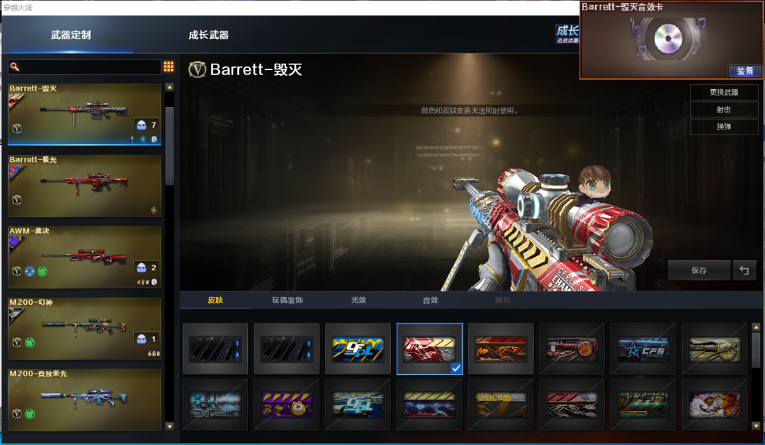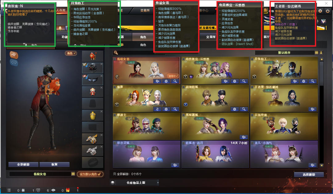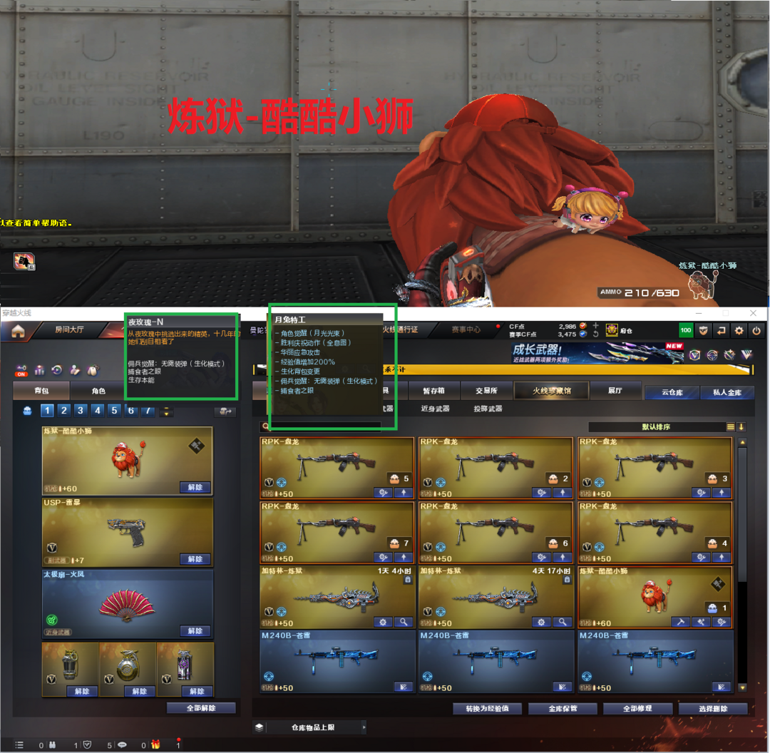 装备描述:排位:可以、、、、、、、、、、、生化全装(可以变更背包、查看生化僵尸血量):无需换弹、炼狱-酷酷小狮、6盘龙、斯太尔蝴蝶、死亡之眼、超级对讲机、全部弹匣、、、、、、、爆破四防:幻神3皮(YZK、巅峰荣耀、降龙皮肤)、M200-竞技荣光、王者星神、、、、USP雷暴、USP雷暴王者、3个COP堕天神、柯尔特竞技荣光、世冠柯尔特、冠军之特、、、、G36幻影、传说圣谕、传说暗裔、FAMAS G2-天戎、白虎、QBZ金色蔷薇、、、裁决音效、蔷薇音效、白虎音效、毁灭音效、擎天音效、、、5套夜魔、2套竞技荣光、2套量子之心、4套雷暴王者、、、生化人物(月兔特工、夜玫瑰-N)、爆破四防(传说女帝、云悠悠、王者惊若翩鸿)