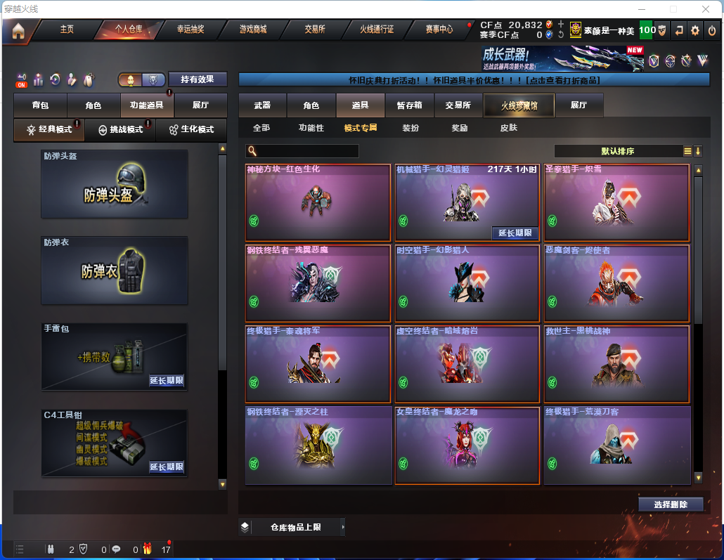 时空猎手✨17个生化皮肤✨斯泰尔蝴蝶小毒蜂✨四防生化角色✨炼狱带皮幻神✨满榴弹不退包全鬼✨无炽芒蝶刃