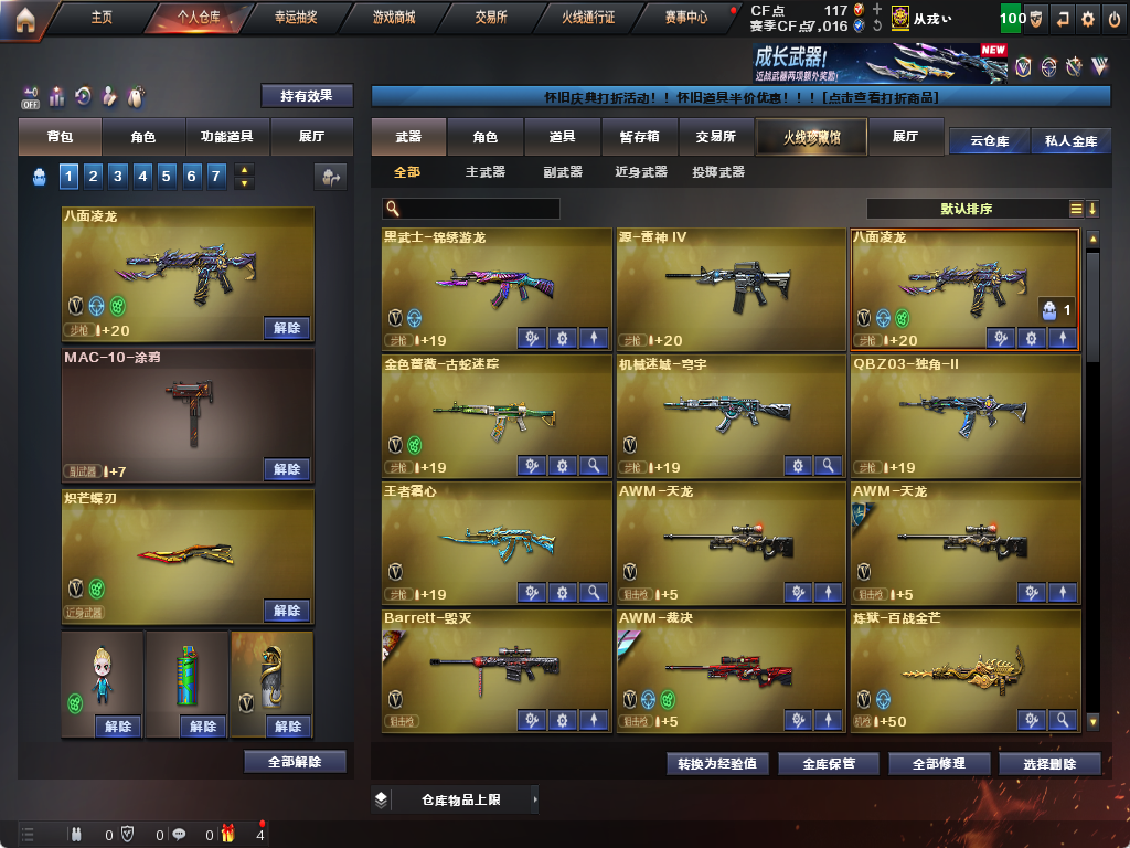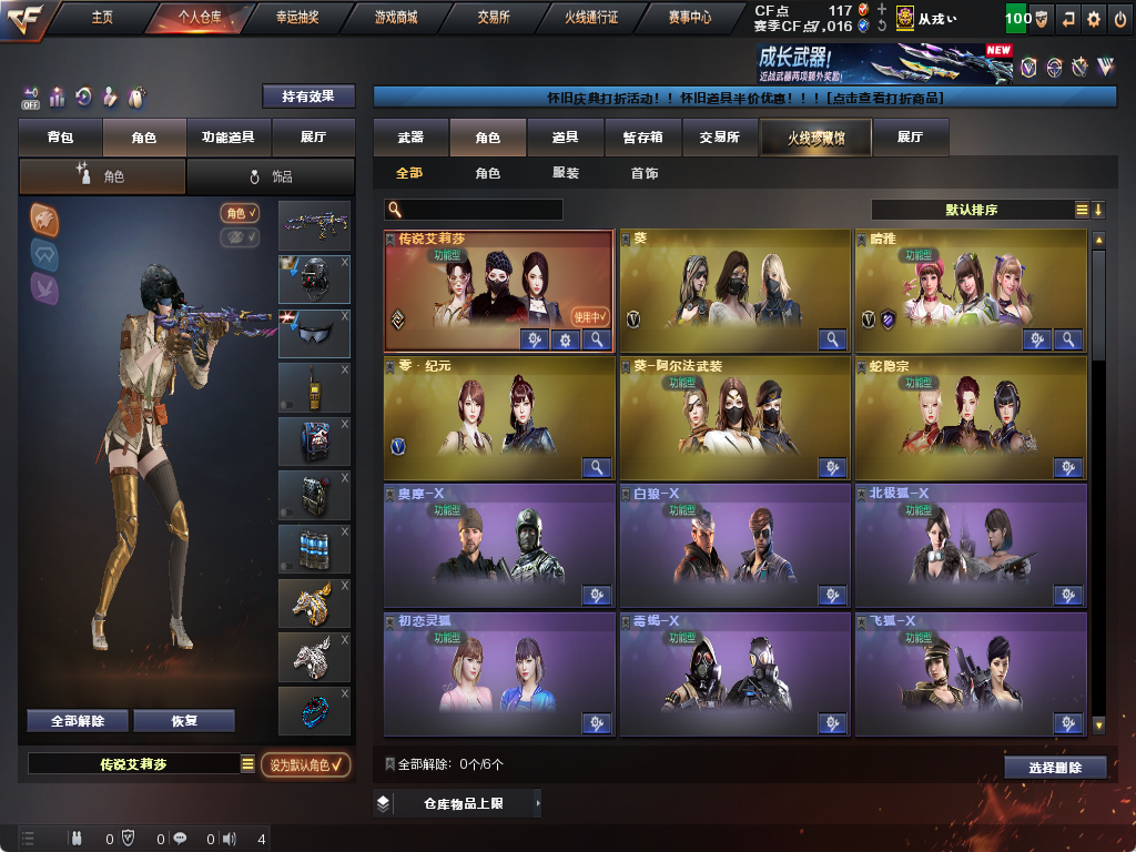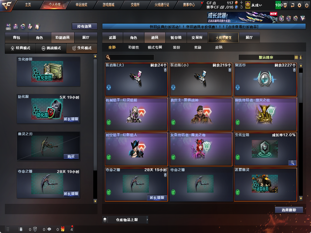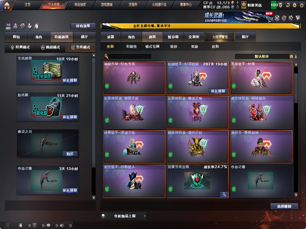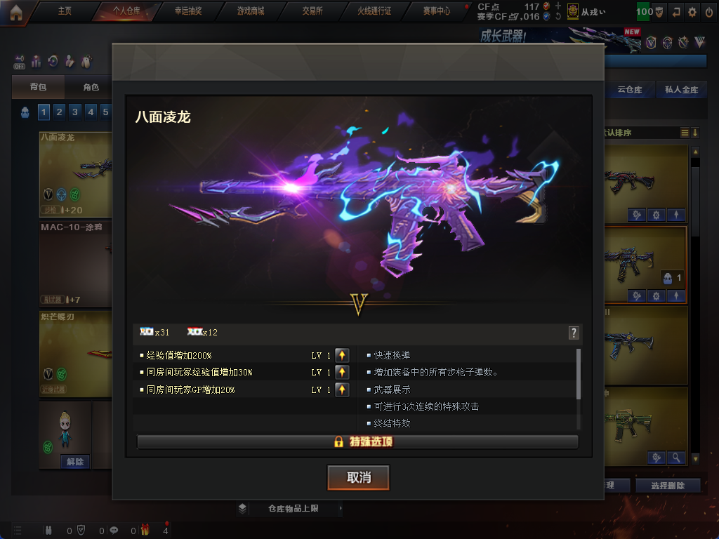 限制: 租号3次及以上 | 撤单率<90%才可租用此帐号装备描述:生化炽芒蝶刃♉满氪满配八面凌龙♉幻影猎人♉传说艾莉沙♉四防生化背包♉不退包全鬼满榴弹减速♉无6盘6烈