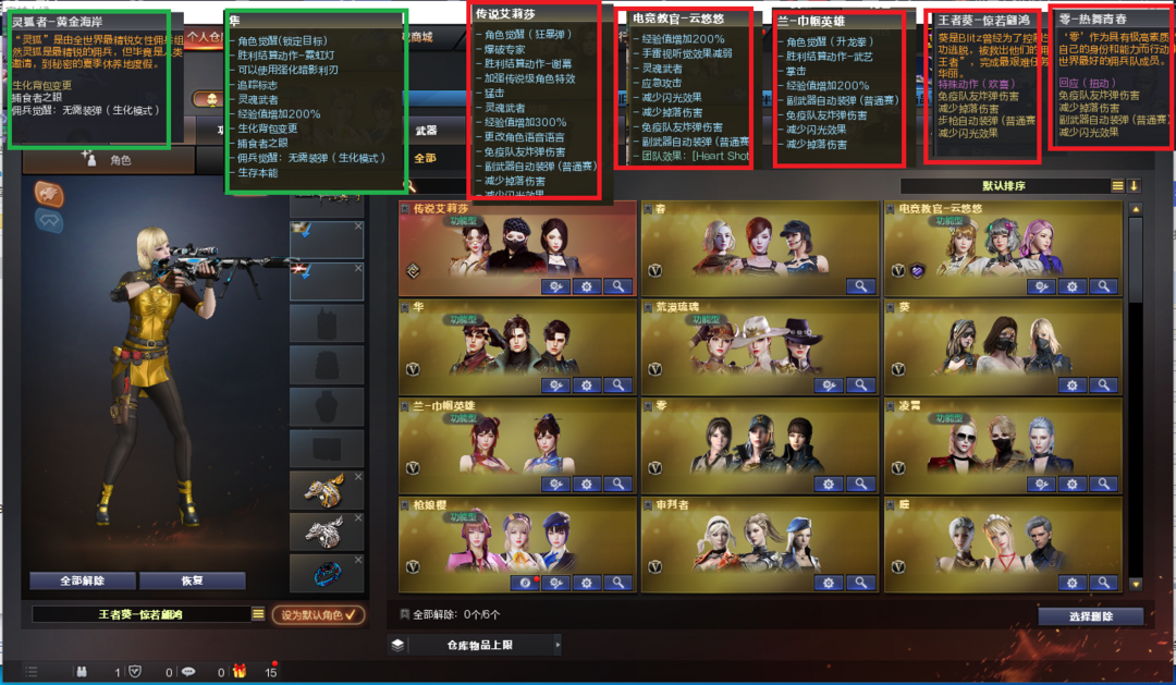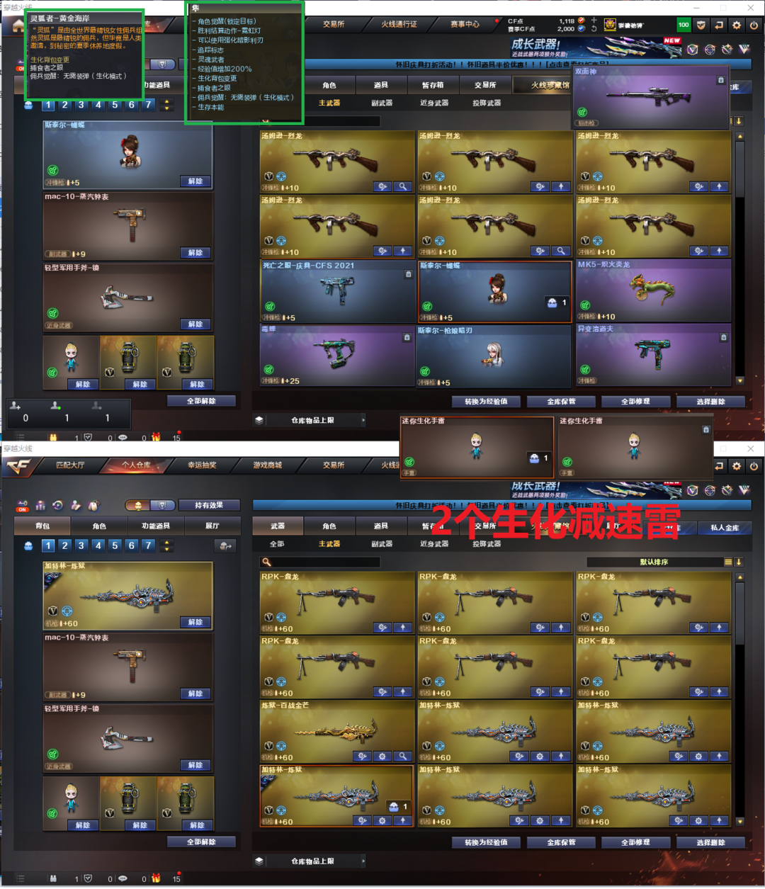 装备描述:排位:可以--------------生化四防全装(可以变更背包、查看生化僵尸血量):无需换弹、6烈6盘、炼狱、斯泰尔蝴蝶、斯太尔枪娘暗刃、毒蜂、MK5-炽火炎龙、异变清道夫、双面神、死亡之眼、MAC手枪、手斧镜、2个永久减速雷、全部弹匣、、、、、、、、、爆破全装:幻神音效(23白鲨皮肤)、M200-竞技荣光、王者风神、98K星神、2个USP雷暴、COP雷霆、CCOP堕天神、2个柯尔特竞技荣光、COP幻灵、USP神工天巧、COP云龙、2个世冠柯尔特、、、幻神音效、裁决音效、白虎音效、极光音效、毁灭音效、雷神音效、火麒麟音效、黑骑士音效、、、1套幻兽、8套竞技荣光、7套神工天巧、8套云龙、、、生化四防(隼、灵狐者-黄金海岸)爆破四防(传说艾莉莎、云悠悠、兰-巾帼英雄、月兔特工、王者惊若翩鸿、零-热舞青春)