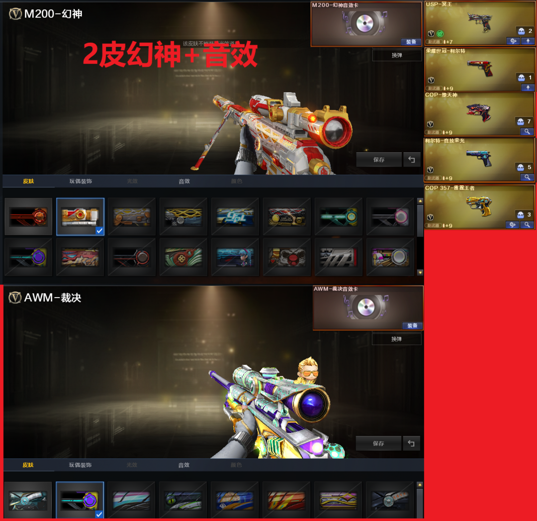 装备描述:排位:可以、、、、、、、、、、爆破四防:幻神2皮肤+音效(24AG冠军、丹凤皮肤)、M200-竞技荣光、、、、USP冥王、COP堕天神、世冠柯尔特、柯尔特竞技荣光、COP雷霆王者、传说光耀、传说暗裔、白虎、QBZ金色蔷薇、QBZ天罚、王者蔷薇、、、幻神音效、裁决音效、蔷薇音效、白虎音效、毁灭音效、雷神音效、黑龙音效、火麒麟音效、黑骑士音效、、、2套竞技荣光、1套玄豹、2套雷霆王者、2套王者之魄、、、爆破四防(传说女帝、云悠悠、王者魅影、王者惊若翩鸿、王者华冠丽服、葵.赛.博.朋.克.)