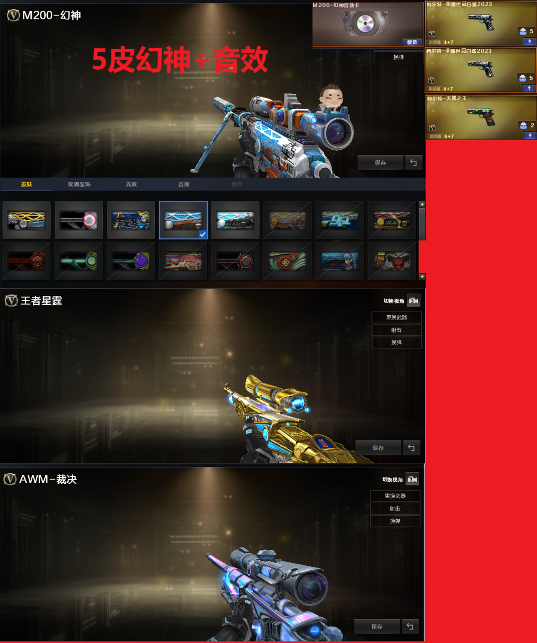 装备描述:排位:可以--------------爆破四防:幻神5皮+音效(23白鲨、星火小队、宠儿、曹操、周瑜皮肤)、王者星霆、2个23白鲨柯尔特、无冕之王、白虎、QBZ云龙、QBZ金色蔷薇、炽芒蝶刃、、、幻神音效、白虎音效、、、爆破四防(传说影煞、王者影豹)