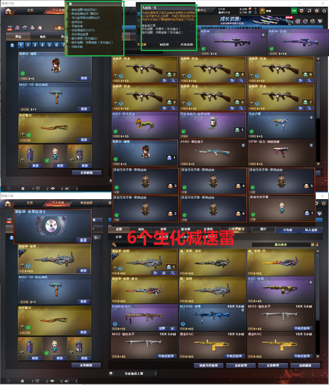 装备描述:排位:可以--------------生化四防(可以变更背包、查看生化僵尸血量):无需换弹、6烈、炼狱+音效、八面凌龙、双面神、斯太尔蝴蝶、异变清道夫-小人枪、MK5-炽火炎龙、死亡之眼、MAC涂鸦、炽芒蝶刃、手斧镜、6个生化减速雷、、、、、、、、、爆破四防:幻神音效(24AG冠军)、、、、USP雷暴、传说夜魔、3个COP云龙、2个23白鲨柯尔特、玄豹左轮、FAMAS G2-天戎、QBZ云龙、白虎、、、幻神音效、裁决音效、白虎音效、毁灭音效、天罚音效、炼狱音效、黑骑士音效、、、2套云龙、6套玄豹、、、生化四防(隼、蛇隐宗、飞虎队)爆破四防(华、机械姬)