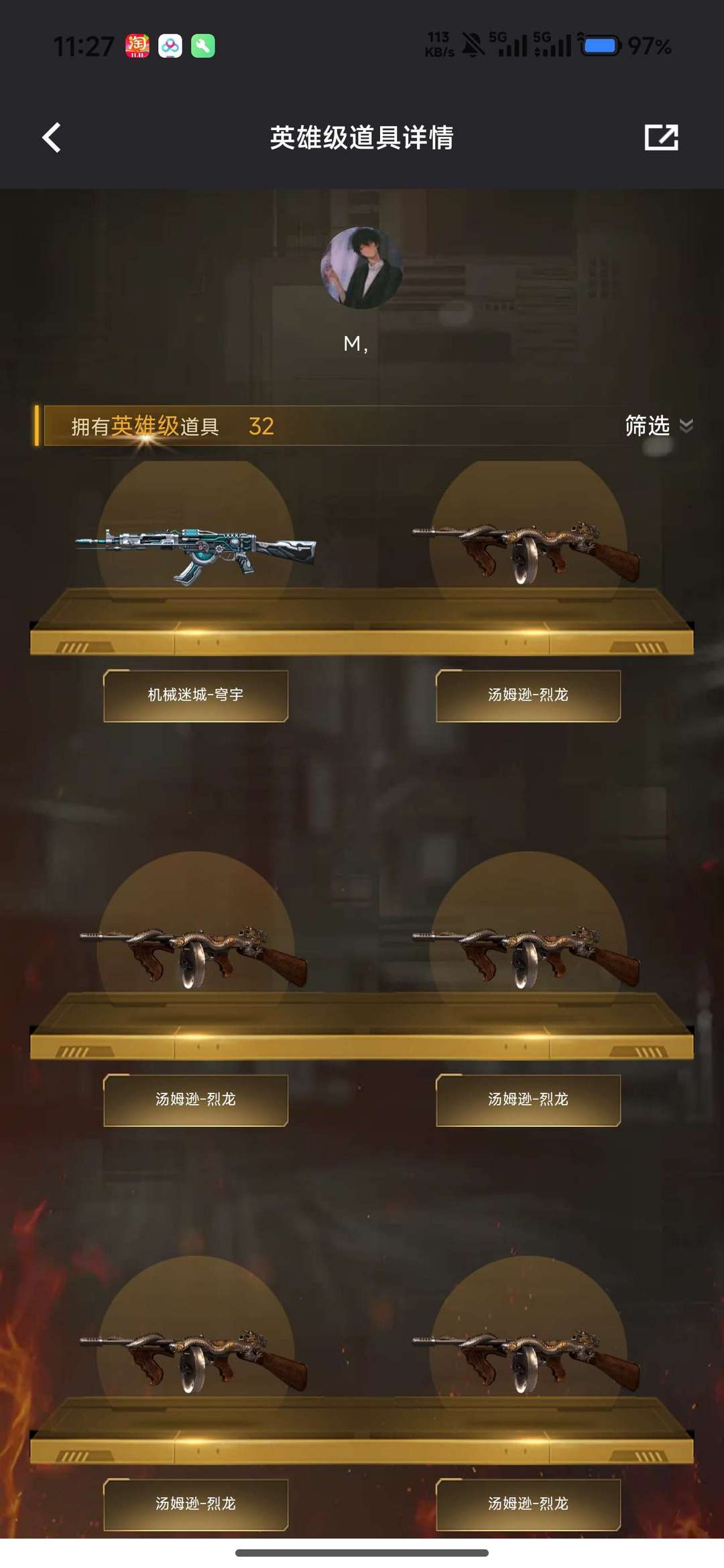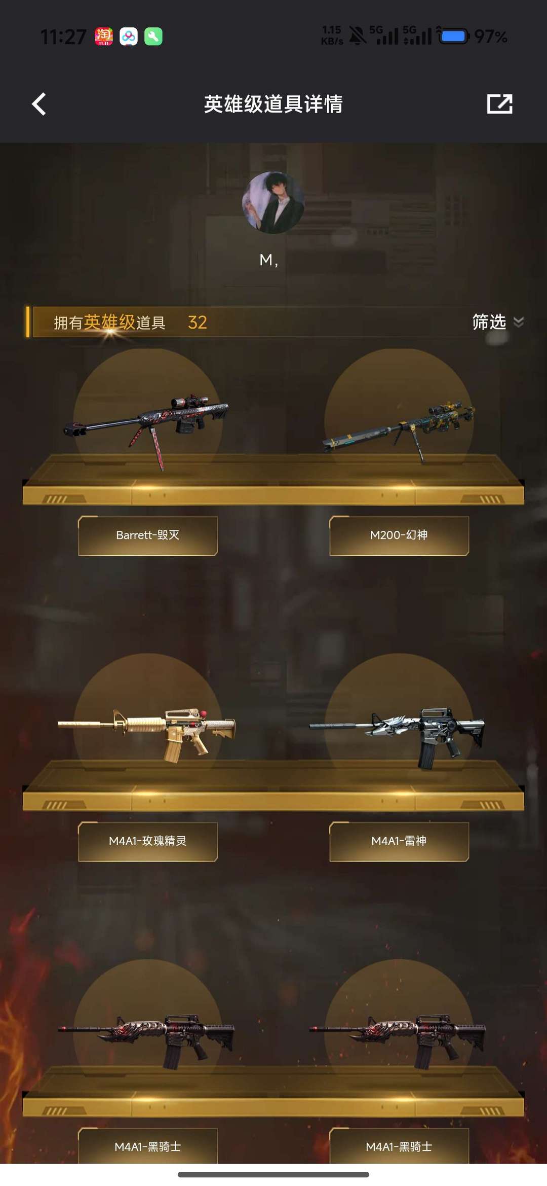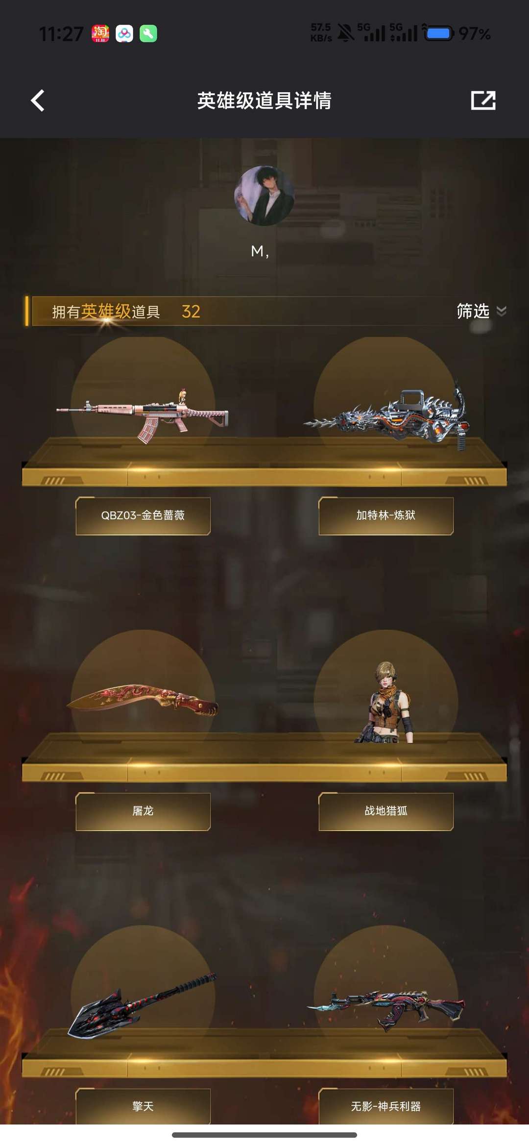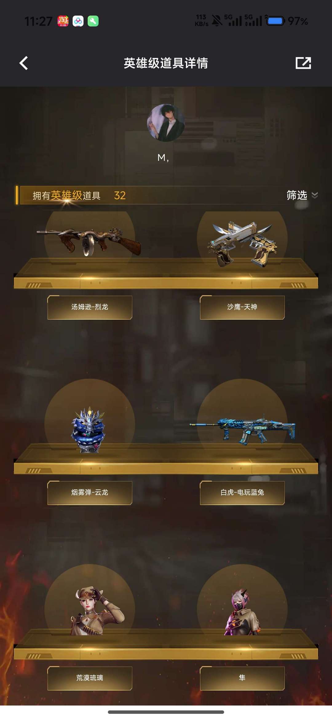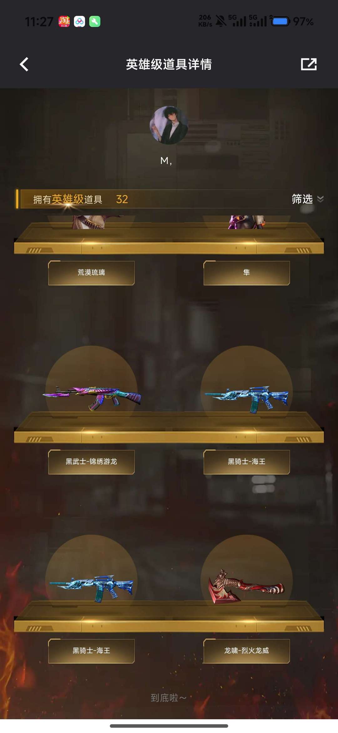 装备描述:荒漠琉璃 隼 6盘龙 蝴蝶斯太尔 幻神 毁灭音效卡 毁灭星空皮肤