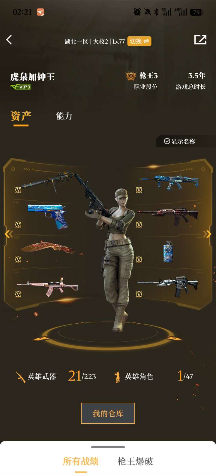装备描述:幻神黄忠,黑骑士音效卡,最新世冠ep柯尔特和金色蔷薇,雷神好皮肤,爆破好号(好价)还有玄武,生化角色有全套装效果,爆破有多个三防