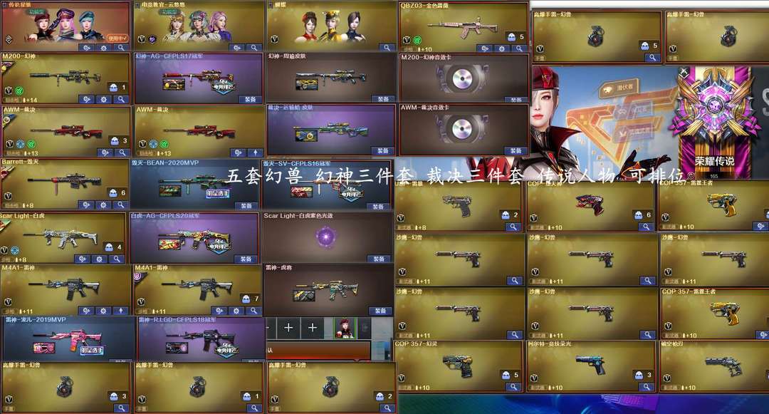 五套幻兽-双幻神三件套-裁决三件套-手枪满配-传说人物-白虎qbz-竞技荣光套-雷暴套-可排位