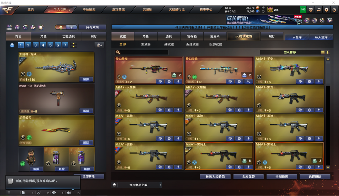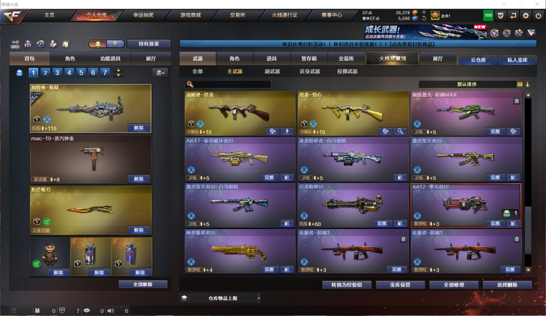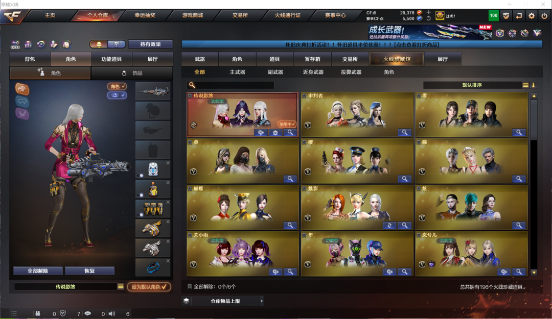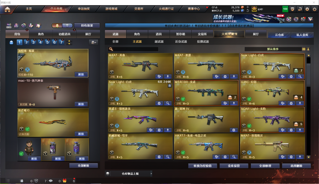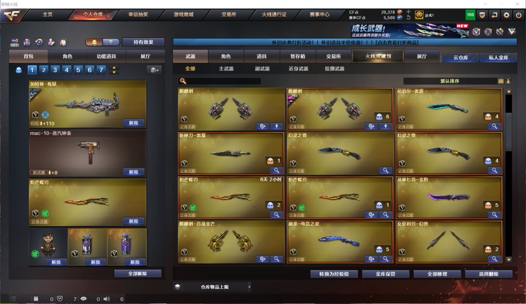 装备描述:生化全装:传说影煞、7盘、7炼狱、斯泰尔蝴蝶、异变清道夫蛇影双娇、生化弹匣、生化钩、时空猎手皮肤;爆破全装:白虎玄武星神三幻神传说灵眸传说梦魇、玄豹烟、大量V手枪、USP雷暴、COP、沙鹰幻兽等;挑战全装:全次元套、挑战等级较高、满级激光