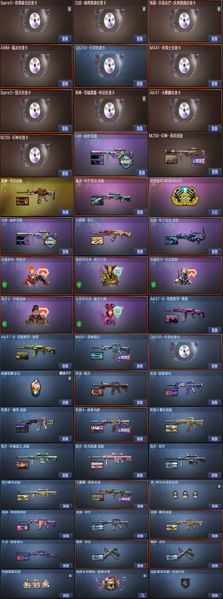 装备描述:VIP6 131V,2王者,1炫金,传说辉光/幻神黄忠/幻神巅峰荣耀/毁灭英雄计划 /毁灭虹光风暴 /毁灭百城浙江 /毁灭星空/毁灭荣耀之怒/毁灭耀金/天龙传奇70KG/天龙能量核心/传说星骇 _零/_炫/电竞教官-云悠悠/隼/机械姬/M200-幻神/M200-竞技荣光/Barrett-毁灭/barrett-金色蔷薇/Barrett-暗月传说/竞技荣光套装/夜魔套装/M200-幻神音效卡/QBZ03-天罚音效卡/白虎-盛典舞曲音效卡/M4A1-黑骑士音效卡/AK47-火麒麟音效卡/死神-雪域霜狐-怀旧音效卡/Barrett-毁灭音效卡/AWM-裁决音效卡/Barrett-碧霄极光音效卡/炼狱-百战金芒-庆典舞曲音效卡