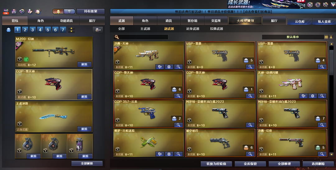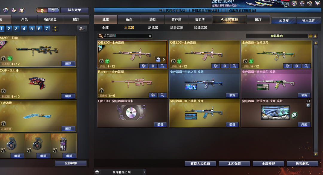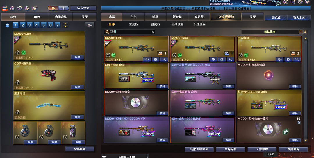 装备描述:VIP6 212V 18王者 5炫金 幻神Heartshot /幻神电流骇客 /幻神荣耀世冠白鲨2023 /幻神N9/幻神宠儿/Kar98K星神AGCFPLS21冠军/星神破竹/毁灭SV/毁灭百城浙江 /毁灭CFS2020/_零/_蝴蝶_/魅影/_迷迭香/关小雨/M200-幻神(2)/王者幻神-觉醒版/Barrett-毁灭(2)/Barrett-极光/barrett-金色蔷薇/堕天神套装/幻兽套装/网剧冠军套装/Barrett-极光音效卡/Kar98K-星神音效卡/M200-幻神音效卡/M4A1-黑骑士音效卡/QBZ03-金色蔷薇音效卡/M4A1-雷神音效卡/Barrett-毁灭音效卡/裁决音效卡