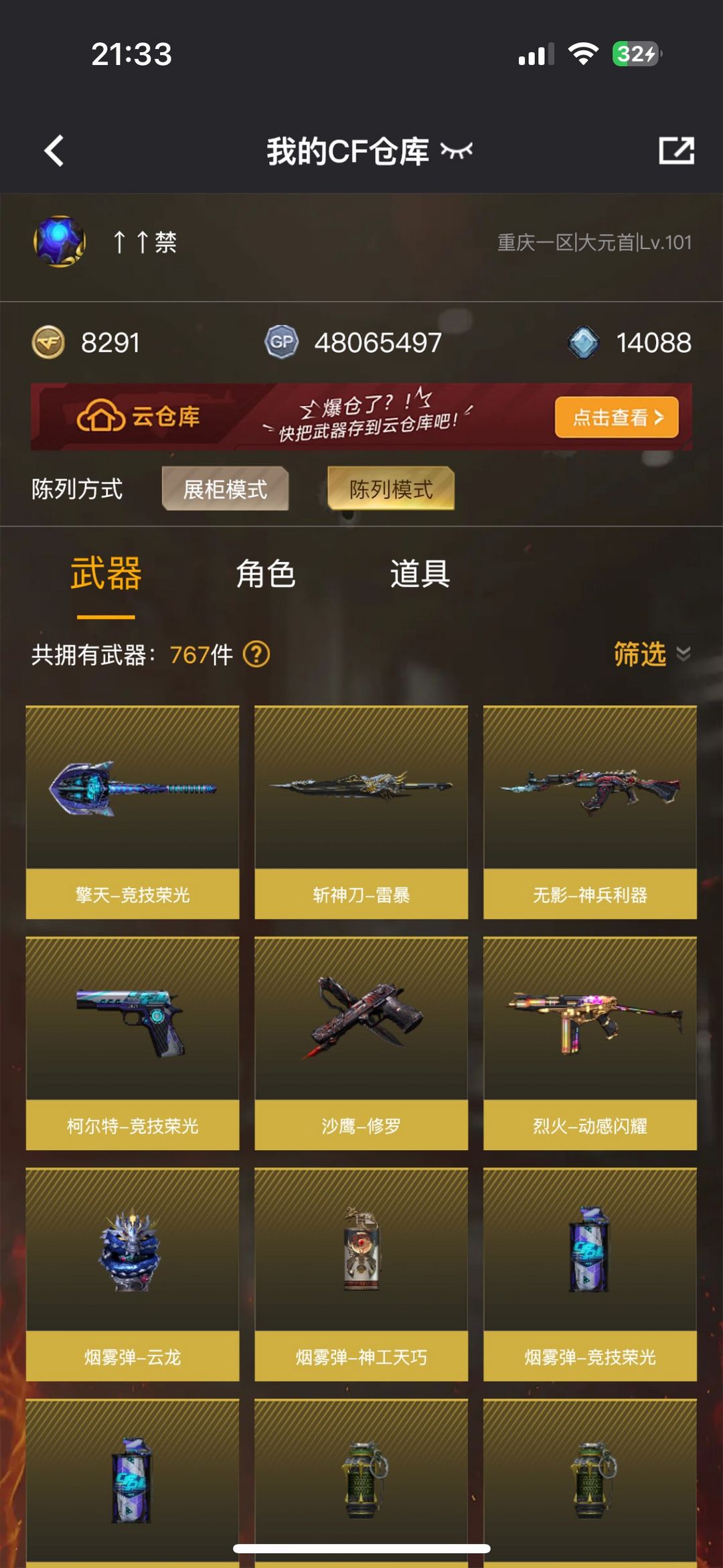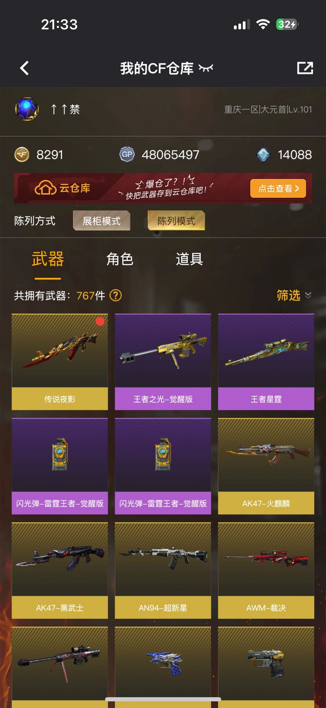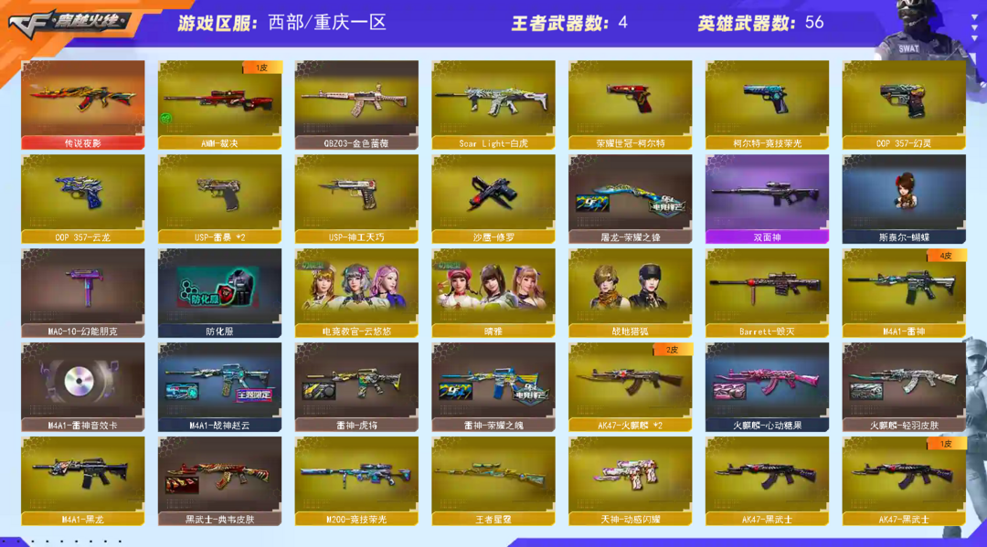 装备描述:王者武器:闪光弹-雷霆王者-觉醒版;王者星霆;王者之光-觉醒版 英雄武器:AK47-火麒麟;M4A1-黑龙;AWM-天龙;荣耀世冠-柯尔特;手雷-热带奇洋;AWM-裁决;Scar Light-白虎;COP 357-云龙;闪光弹-云龙;烟雾弹-云龙;高爆手雷-云龙;USP-雷暴;高爆手雷-雷暴;烟雾弹-雷暴;闪光弹-雷暴;斩神刀-雷暴;黑武士-锦绣游龙;HK417-朱雀;COP 357-幻灵;烈火-动感闪耀;天神-动感闪耀;屠龙-动感闪耀;手雷-动感闪耀;沙鹰-修罗;无影-神兵利器;烟雾弹-神工天巧;USP-神工天巧;屠龙;传说夜影;麒麟刺;AK47-火麒麟;QBZ03-金色蔷薇;AN94-超新星;Barrett-毁灭;AK47-黑武士;高爆手雷-竞技荣光;闪光弹-竞技荣光;烟雾弹-竞技荣光;柯尔特-竞技荣光;擎天-竞技荣光;M200-竞技荣光;M4A1-雷神 角色:电竞教官-云悠悠;晴雅;刀锋;幻影;复仇者;堕天使;灵狐者;活力灵狐;兰;夜玫瑰;威锋;陈龙野-X;陈龙野-Y;猎狐者-英特尔;救世复仇;精英部队;灵狐者;烈锋;王力宏;灵狐者-黄金海岸;雷豹;蜀雪;潜龙队-X;暗夜-X;北