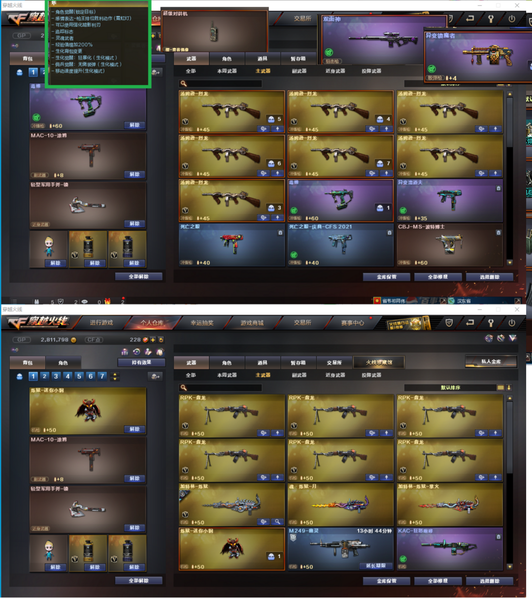 装备描述:排位:可以-------------生化压力全装号(变更生化背包、可以看僵尸血量):无需换弹、6烈6盘 、2炼狱、炼狱小钢、KAC狂怒咆哮、双面神、异变清道夫、异变镇魔者、毒蜂、死亡之眼、MAC-涂鸦、手斧镜、7个生化减速雷、超级对讲机、全部弹匣、减少停顿道具、、、、、生化人物(隼、王者涂鸦)