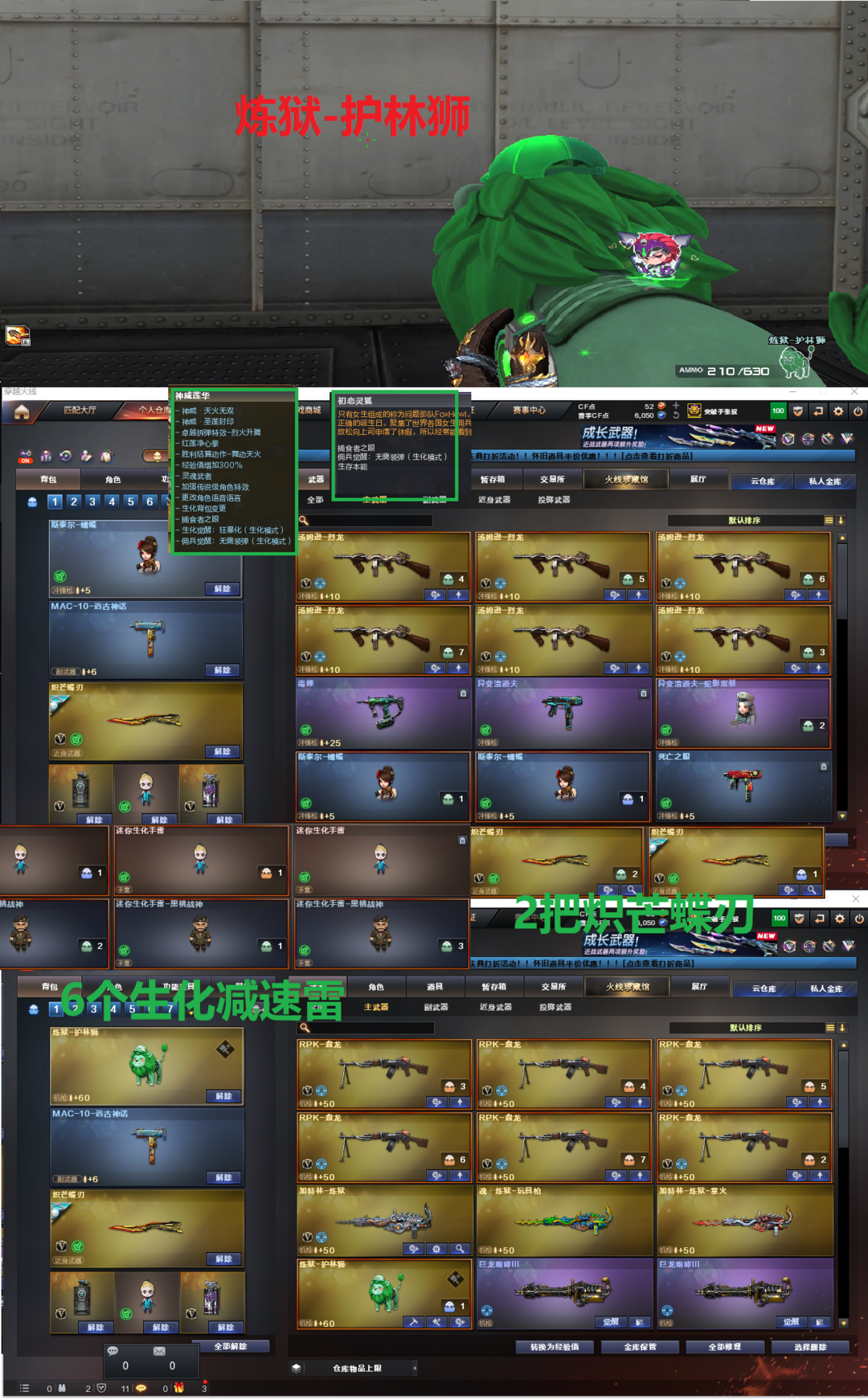 装备描述:排位:可以、、、、、、双清道夫-可以无限卡子弹、、、生化四防极品(可以变更背包、看僵尸血量):无需换弹、6烈龙、6盘龙、炼狱-护林狮、斯泰尔蝴蝶、异变清道夫、清道夫-小人枪、毒蜂、双面神、死亡之眼、MAC-涂鸦、2把炽芒蝶刃、手斧镜、6个生化减速雷、超级对讲机、全部弹匣、、、、、、、、爆破四防:幻神6皮+音效(KZ、电竞之星、宠儿、黄忠、动感闪耀皮肤)、王者星神、王者风神、M200-竞技荣光、、、、USP雷暴、6个USP冥王、COP雷霆、COP堕天神、COP幻灵、2个冠军之特、玄豹左轮、、、G36幻影、FAMAS G2-天戎、加利尔ACE-天袭、白虎、、、幻神音效、裁决音效、白虎音效、毁灭音效、雷神音效、天罚音效、极光音效、火麒麟音效、、、6套雷霆、7套雷暴、4套幻灵、1套云龙、8套玄豹、1套量子之心、1套雷霆王者、6套雷暴王者、、、生化四防(神威莲华、初恋灵狐)、爆破四防(传说艾莉莎、传说星骇、荆棘、玄豹、鹰、雨墨、王者魅影)