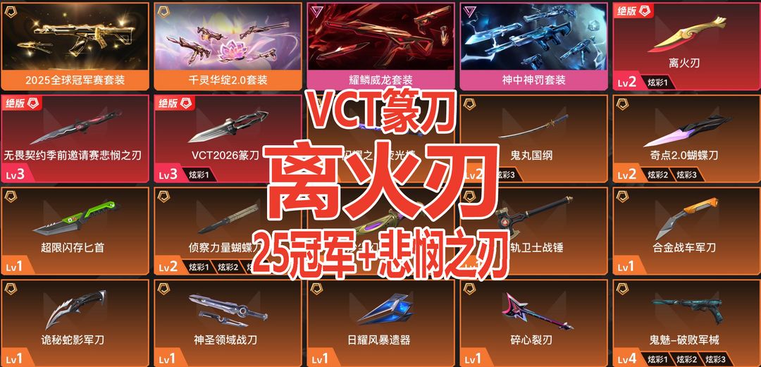 可排位✅顶级10W库存✅离火刃⭐25冠军套⭐VCT篆刀⭐季前邀请赛悲悯之刃⭐千灵华绽2.0套⭐⭐神中