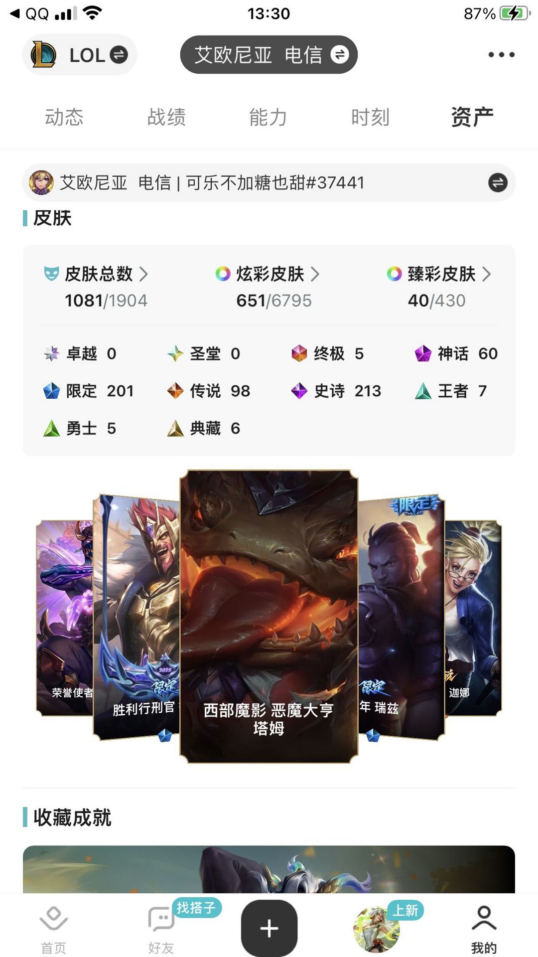 装备描述:龙年限定7➕青年瑞兹❤️1080原皮满英雄❤️644炫彩39臻彩❤️5终极60神话200限定98传说。