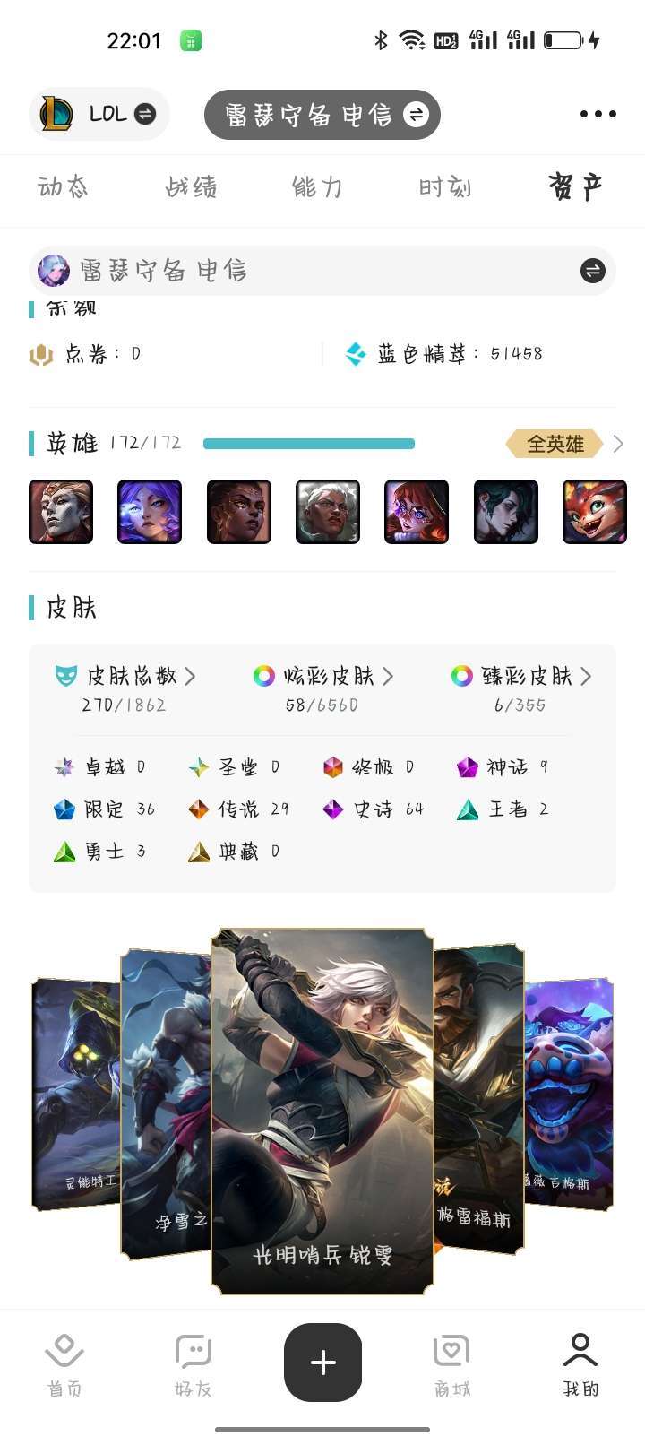 装备描述:全英雄270皮9神话2至臻36限定29传说64史诗喜欢本账号请点 ☆收藏☆ 方便下次租用,谢谢光临惠顾!