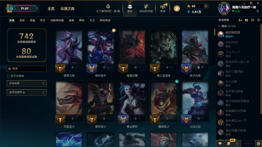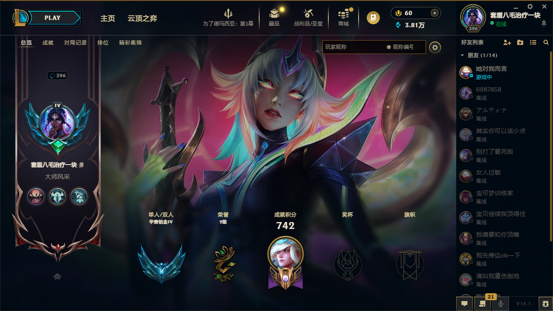 段位:396级 华贵铂金IV级 华贵铂金IV