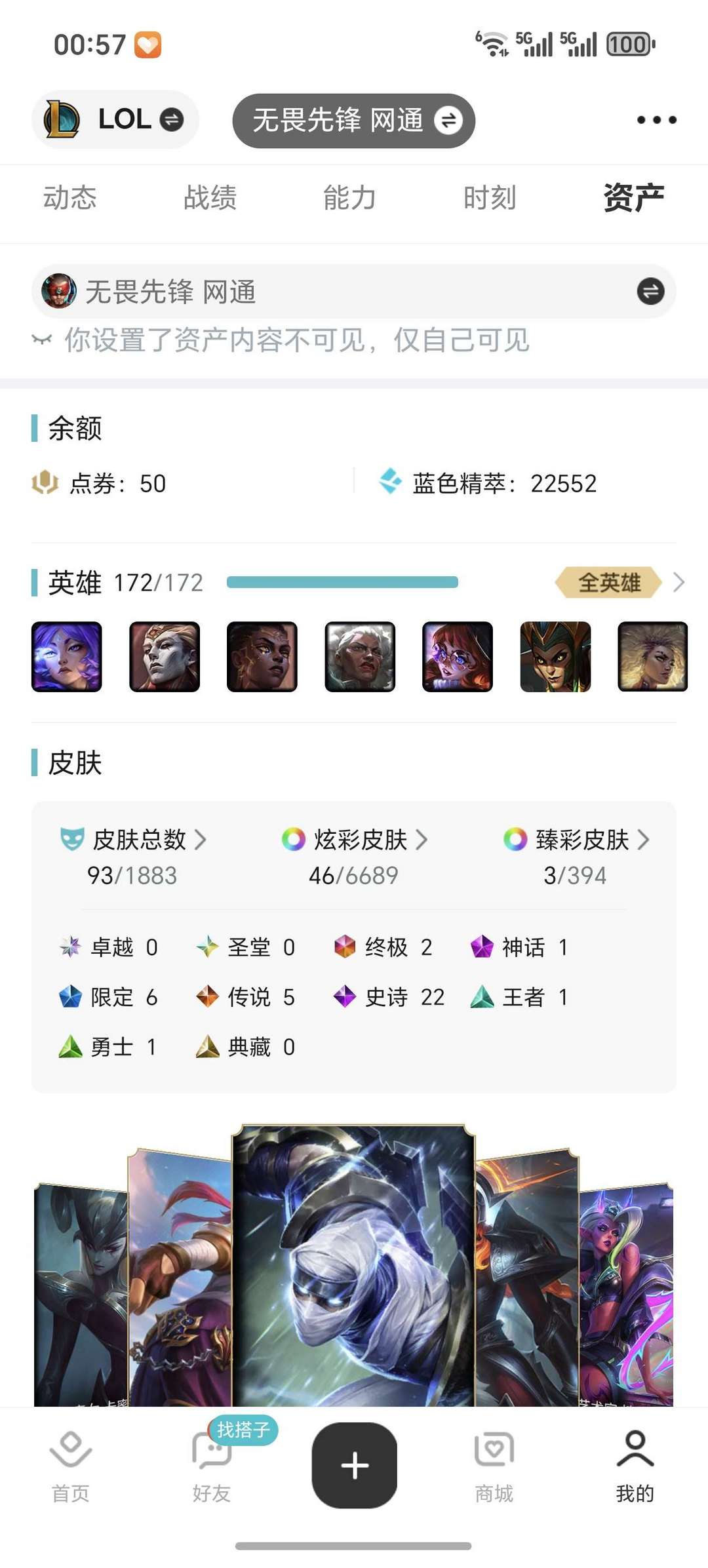 共93个皮肤 常见英雄皮肤都有 英雄全解锁 可打排位