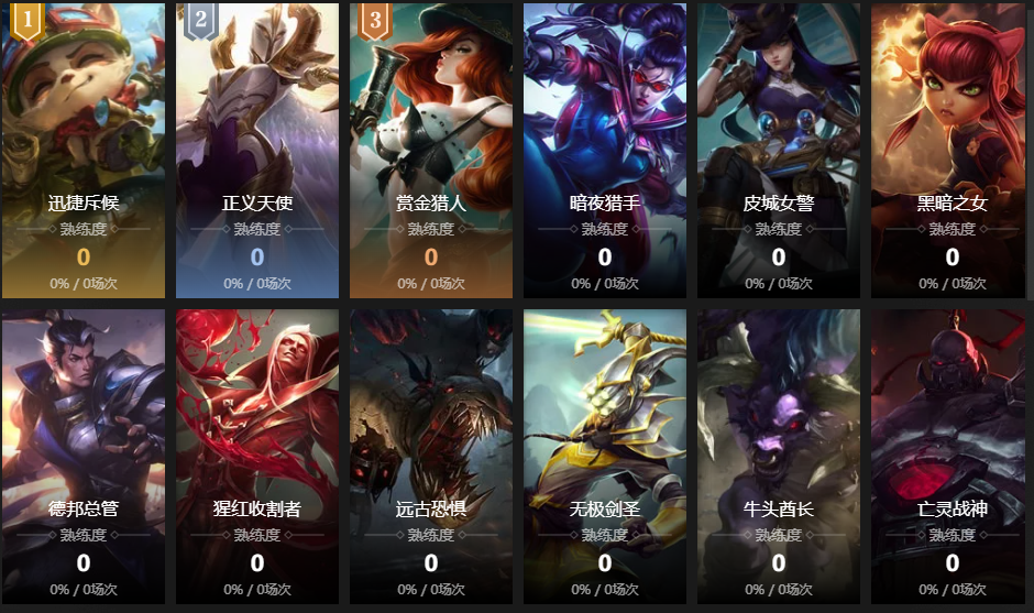暴走萝莉;赏金猎人;逆羽;迅捷斥候;寒冰射手;皮城女警;圣枪游侠;黑暗之女;卡牌大师;德邦总管;诡术