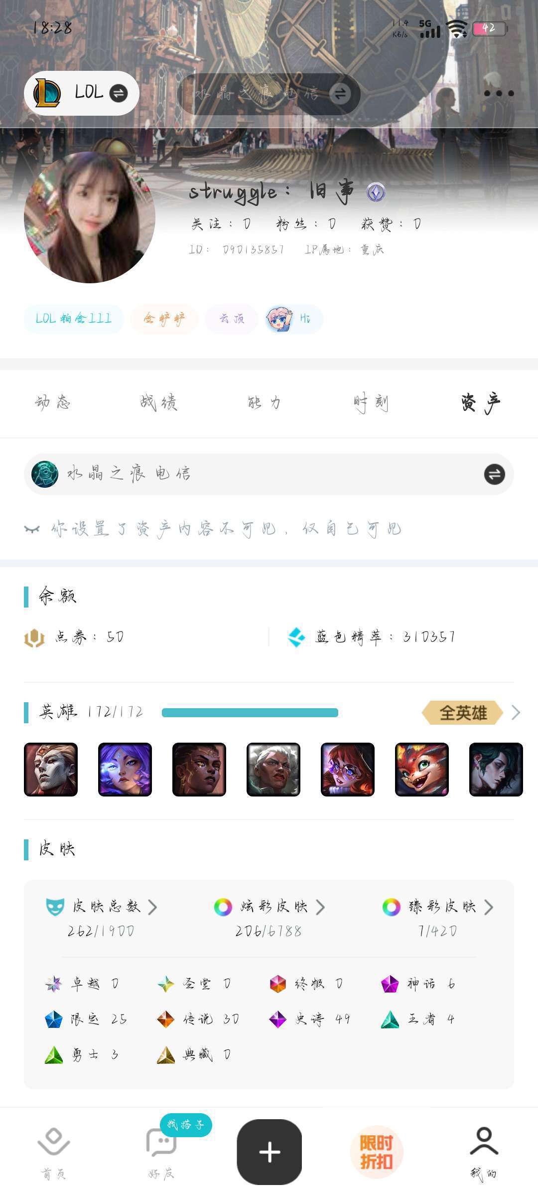 装备描述:全英雄,54个皮肤,随你玩。排位也可玩。