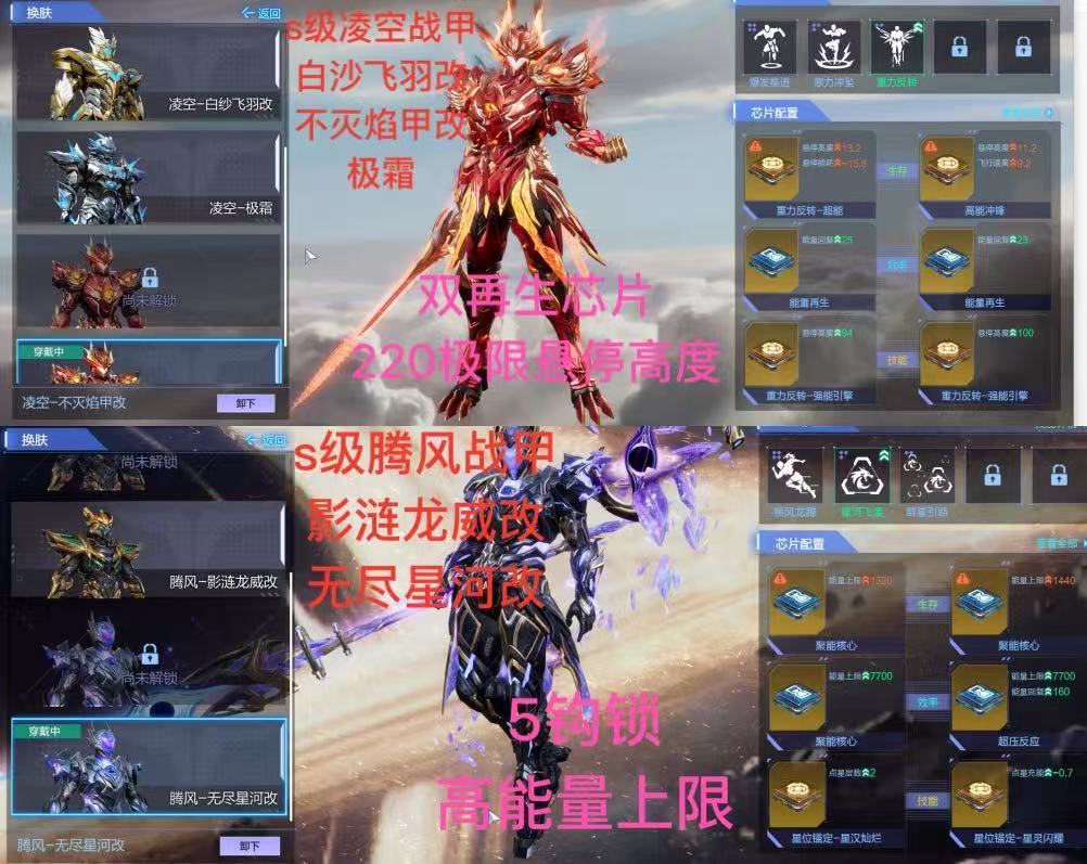 限制: 租号5次及以上 | 撤单率<65%才可租用此帐号装备描述:欢迎老板体验商城号(活动基本全氪金) 请勿解开二级密码发现必永久拉黑,恶意撤单永久拉黑 2金色能量再生 220悬停无敌 冰神武45星 风神武45星 光神武42星 11.14号新增最强boos角色莱纳最强戒指天命观吾戒 11.1新增变身英雄望舒 变身英雄璃缨 10.30新增焚霄皮肤玄烬 蓝羽玄扇双姝 塔防双冰精灵 影戍玄械皮 10.9新增腾风-无尽星河改 凌空-不灭焰甲改 战甲转换器(腾风凌空双战甲游戏内随意切换) 8.21号新增雷霆之怒战盔(最强) 8.13号新增天耀永夜迷航皮肤+宠物皮肤 8.12号新增传说女王-涅槃再临 蚀日天蝰(女王专属载具) 灵蛇霞披 8.8号新增璃鸢-金翎换肤 强盾-圣誓 7.8号新增天耀套+五核心翅膀 超梦晶体戒指 4.2号新增天枢独角兽面具 天枢戒指 3.20新增能量再生芯片*7 3.11新增联动凤弦苍山皮肤星寰套新皮山海套新皮 1.16新增 狂蟒超梦戒指 凌霄超梦戒指 革新超梦戒指 接引人达瑞娜满配星寰套四核心+宠物 1.2 新增炫酷双人载具幻霜冰爵AVAX 11.29 新增墨韵碧瑚换肤卡 影刃潜灵凯臂 新英雄画灵 11.10 新 变身女英雄龙曦、