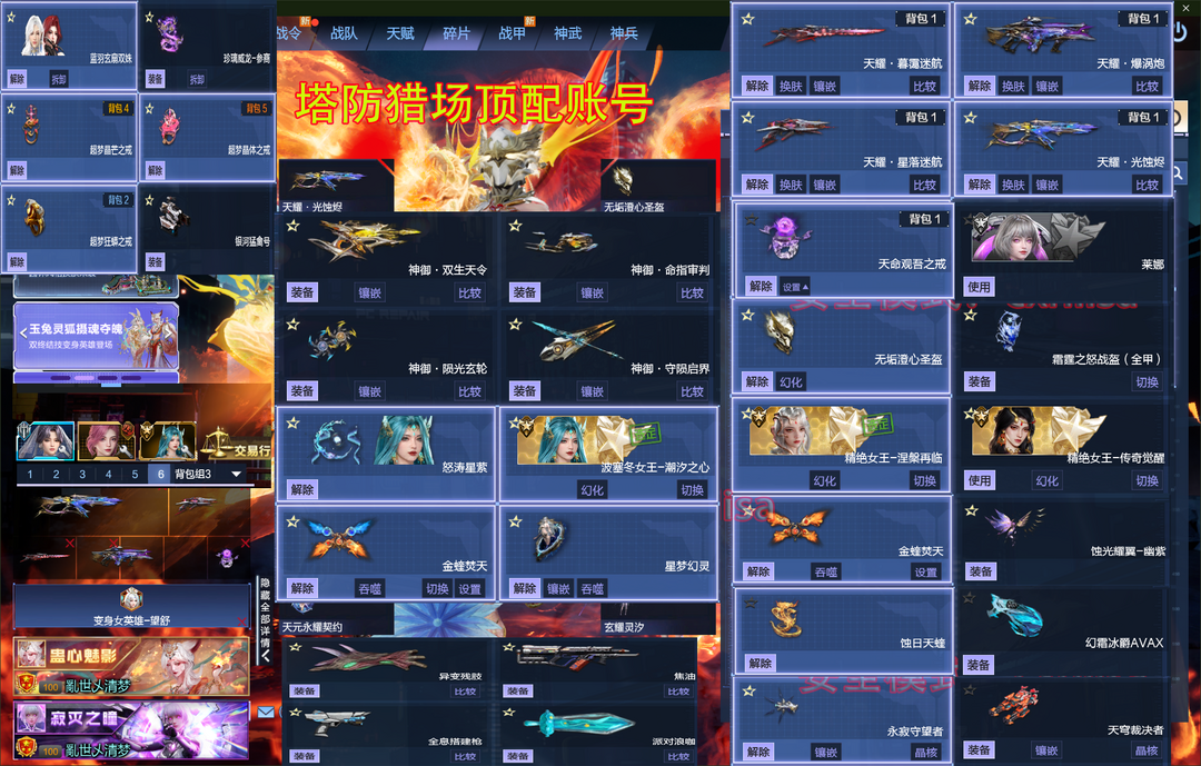 限制: 撤单率<40%才可租用此帐号装备描述:【安全模式可帮解除,点上号器的连系号主发安全码 等待会即可〗五转武装,秘境92关满爆刃,光风冰全45星神武,953基础秘境伤害,带人无敌】【✅NEW新增道具NEW✅】:【波塞冬女王-潮夕之心+涅槃双女王,冰火双色金蝰焚天翼,传奇三女王】【神谕套全核心宠物全皮满核心10+10】〖莱娜 | 天命观吾之戒〗【变身英雄望舒+璃璎丨全息搭建枪+焦油】【塔防拉满影戍-玄械,三臂铠,焚霄-玄烬】光影礼颂婚纱换肤角色丨最新头盔冰雪皇冠霜霆之怒战盔丨英雄焚霄,璃鸢-金翎,强盾-圣誓丨五蜉灵天耀全套满配,超梦晶体戒指