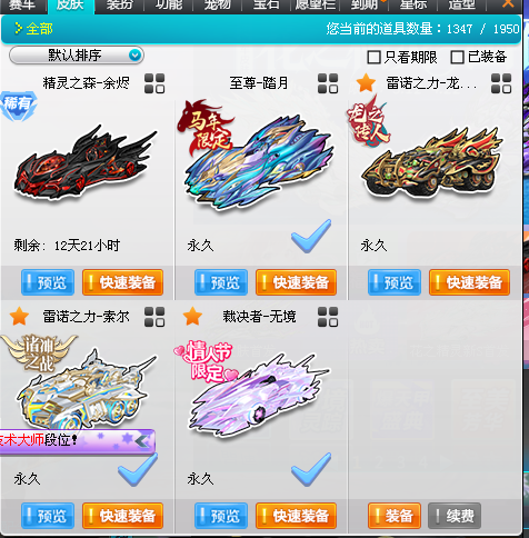 装备描述:【马车】至尊踏月29三四〓雷诺之力索尔龙城飞将双皮肤〓S黑金剃刀〓裁决者无境〓红莲骑士〓10小贵妃