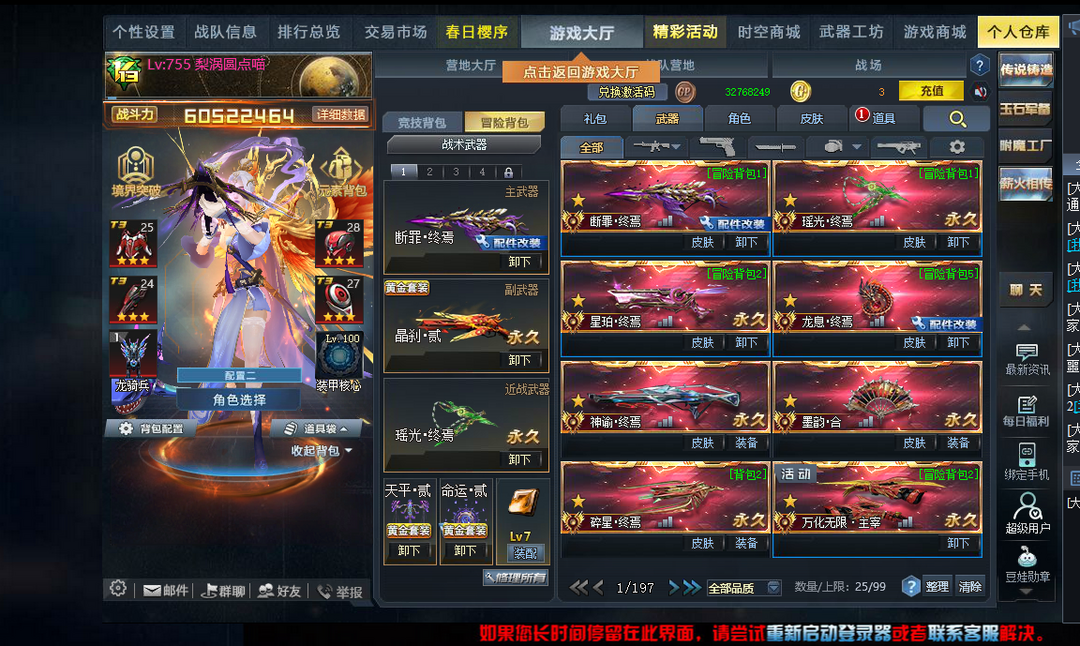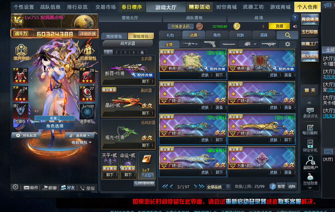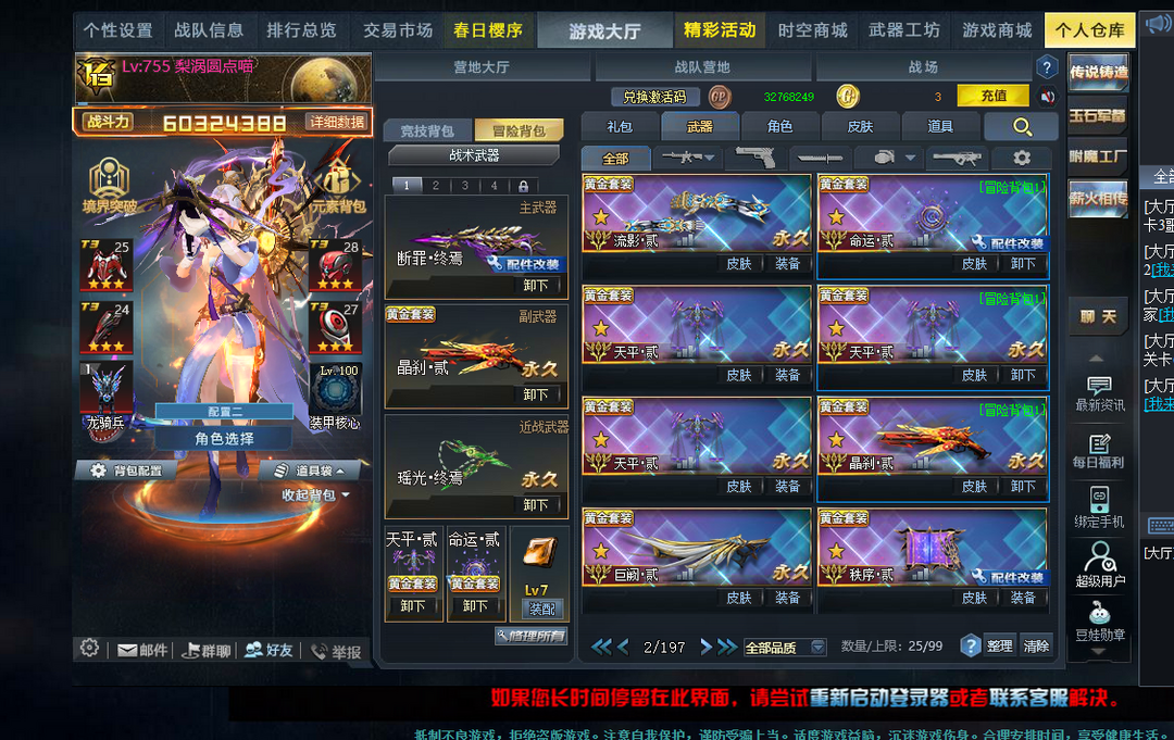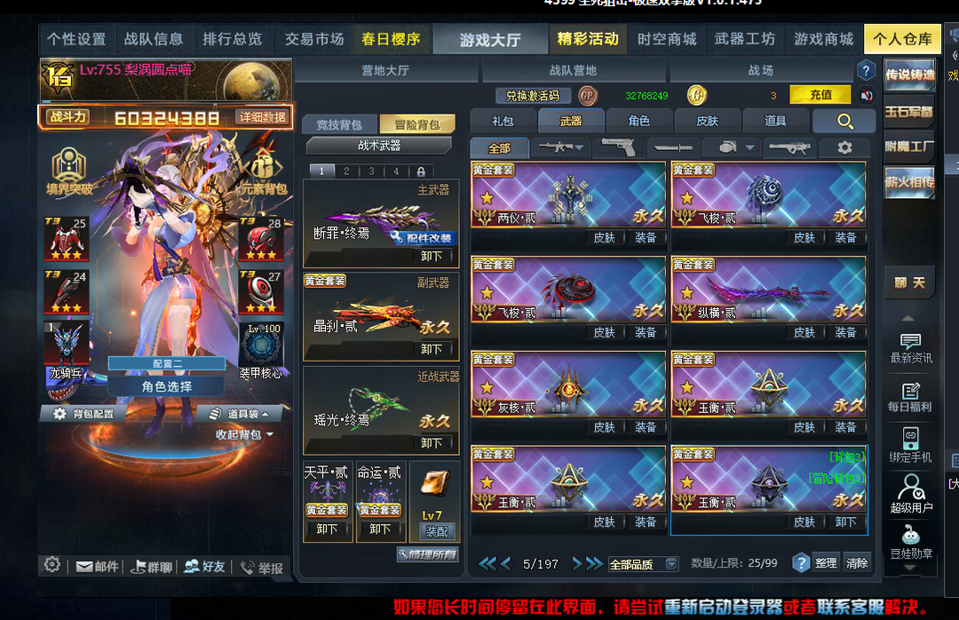 限制: 撤单率<30%才可租用此帐号装备描述:配件武器50+,近期配件全满,三饰品紫霞三饰品阿瑞斯,乱斗爽号,断罪,瑶光,星珀,晶纱各种三强化,各种满配武器,三天平,五广陵四万象等等各种彩金,详情看图