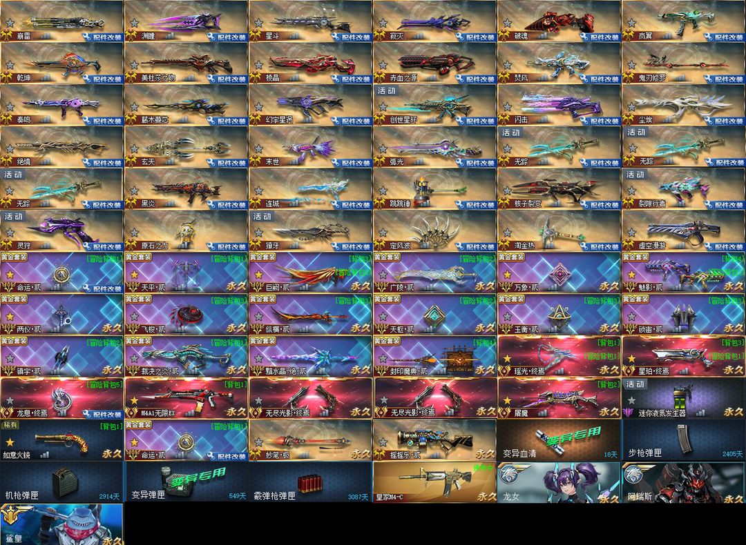 装备描述:配件✨崩雷丨渊瞳丨星斗丨寂灭丨破魂丨岚翼丨乾坤丨美杜莎之吻丨棱晶丨赤血之源丨焚风丨鬼刃修罗丨奏鸣丨藤木蔓芯丨幻宇星涡丨创世星环丨闪击丨尘埃丨绝境丨玄天丨末世丨弧光丨无踪 x3丨黑炎丨连城丨跳跳锤丨核子裂变丨裂隙行者丨灵狩丨原石之力丨獠牙丨定风波丨淘金热丨虚空漫游丨 彩金✨命运贰丨天平贰丨巨阙贰丨广陵贰丨万象贰丨魅影贰丨两仪贰丨飞梭贰丨纵横贰丨天枢贰丨玉衡贰丨锁宙贰丨镇宇贰丨裁决之炎贰丨黯水晶-绝贰丨封印魔典贰丨 传说✨瑶光终焉丨星珀终焉丨龙息终焉丨无限EX丨无尽光影终焉 x2丨屠魔丨 其他✨迷你液氮发生器丨火铳丨命运贰丨妙笔极丨摇摇乐丨 道具✨变异血清丨弹匣丨 皮肤✨皇家M4丨 角色✨龙女丨阿瑞斯丨鲨皇丨