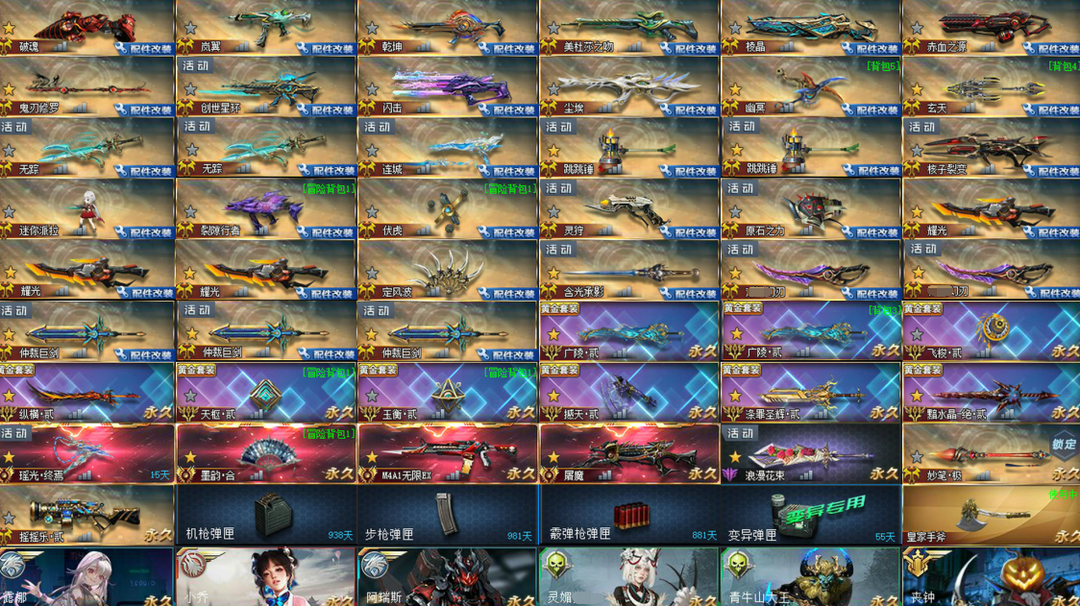 装备描述:配件破魂丨岚翼丨乾坤丨美杜莎之吻丨棱晶丨赤血之源丨鬼刃修罗丨创世星环丨闪击丨尘埃丨幽冥丨玄天丨无踪 x2丨连城丨跳跳锤 x2丨核子裂变丨迷你派拉丨裂隙行者丨伏虎丨灵狩丨原石之力丨耀光 x3丨定风波丨含光承影丨幻刃 x2丨仲裁巨剑 x3丨 彩金广陵贰 x2丨飞梭贰丨纵横贰丨天枢贰丨玉衡贰丨撼天贰丨涤罪圣辉贰丨黯水晶-绝贰丨 传说瑶光终焉丨墨韵合丨无限EX丨屠魔丨 其他浪漫花束丨妙笔极丨摇摇乐丨 道具弹匣丨 皮肤皇家手斧丨 角色露娜丨小乔丨阿瑞斯丨蛮王丨猫妖丨青牛山大王丨丧钟丨