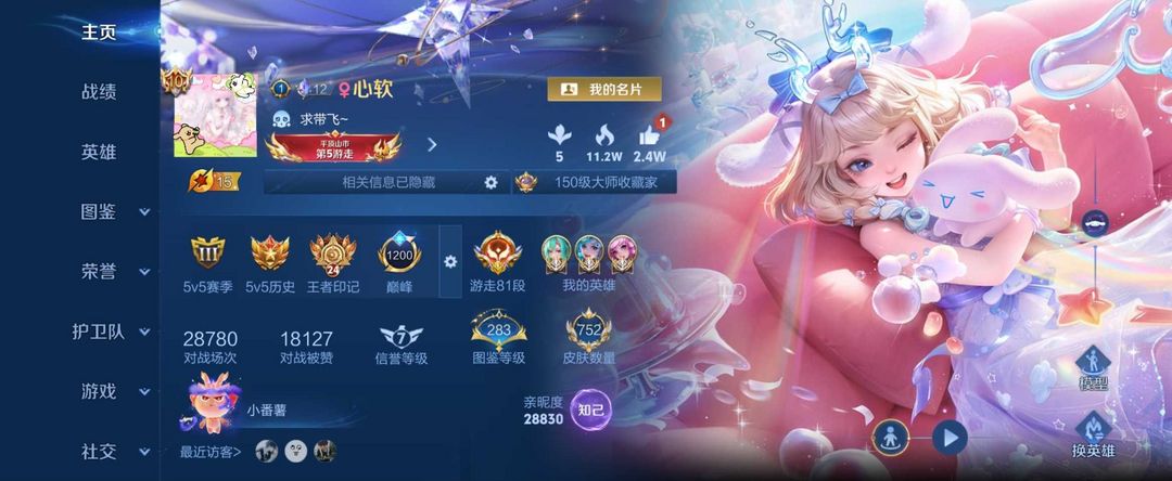 限制: 租号3次及以上 |装备描述:美神降世称号 账号描述:不禁言女用在榜省金牌瑶大桥朵莉亚少司缘 最新皮肤瑶典藏也买了 745皮+15星传说绿巧黑孔雀,传说123个满 10大无双,库洛米全套天幕+全部无双至尊皮肤+永久四传说灵宝+超多局内动作表情特效+龙年贵族邀请+血条皮肤+典藏小兵皮肤 随游戏更新补齐皮肤按键+超多星史诗+全套KPL比赛史诗星元不确认游戏,消极比赛毁号,涉及毁坏虚拟财产罪及计算机安全罪,请文明游戏素质游戏,让我们共建美好租号平台>>>>>> 本游戏账号: V10荣耀贵族用户,基础段位:最强王者,英雄虽然少,应该有你喜欢的英雄。,皮肤目前不多,希望有你喜欢的。1 注意事项: A.游戏过程中请不要恶意挂机或者不文明发言;B.恶意挂机、顶号等行为将被拉黑无法再次下单;C.进入游戏后中途请勿退出登陆,否则无法再