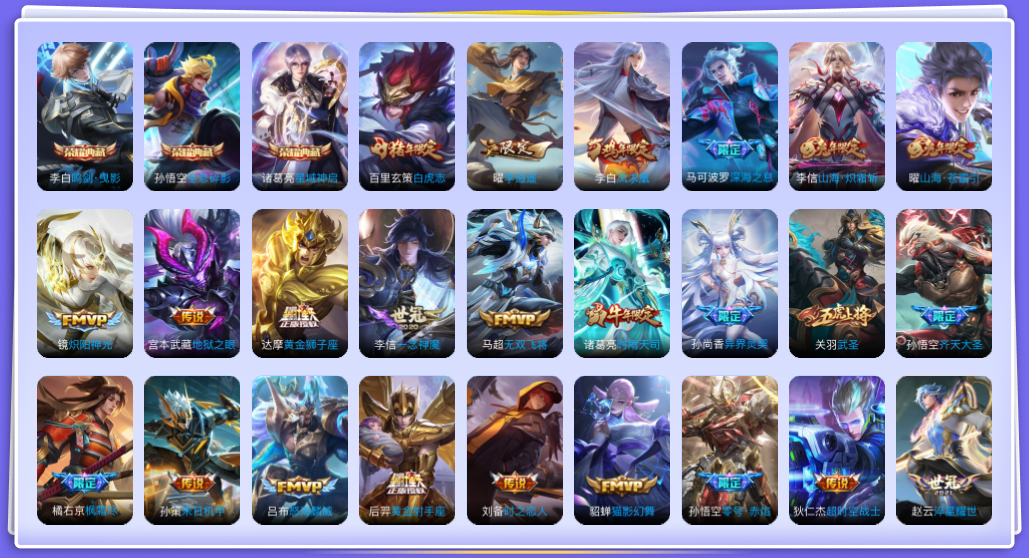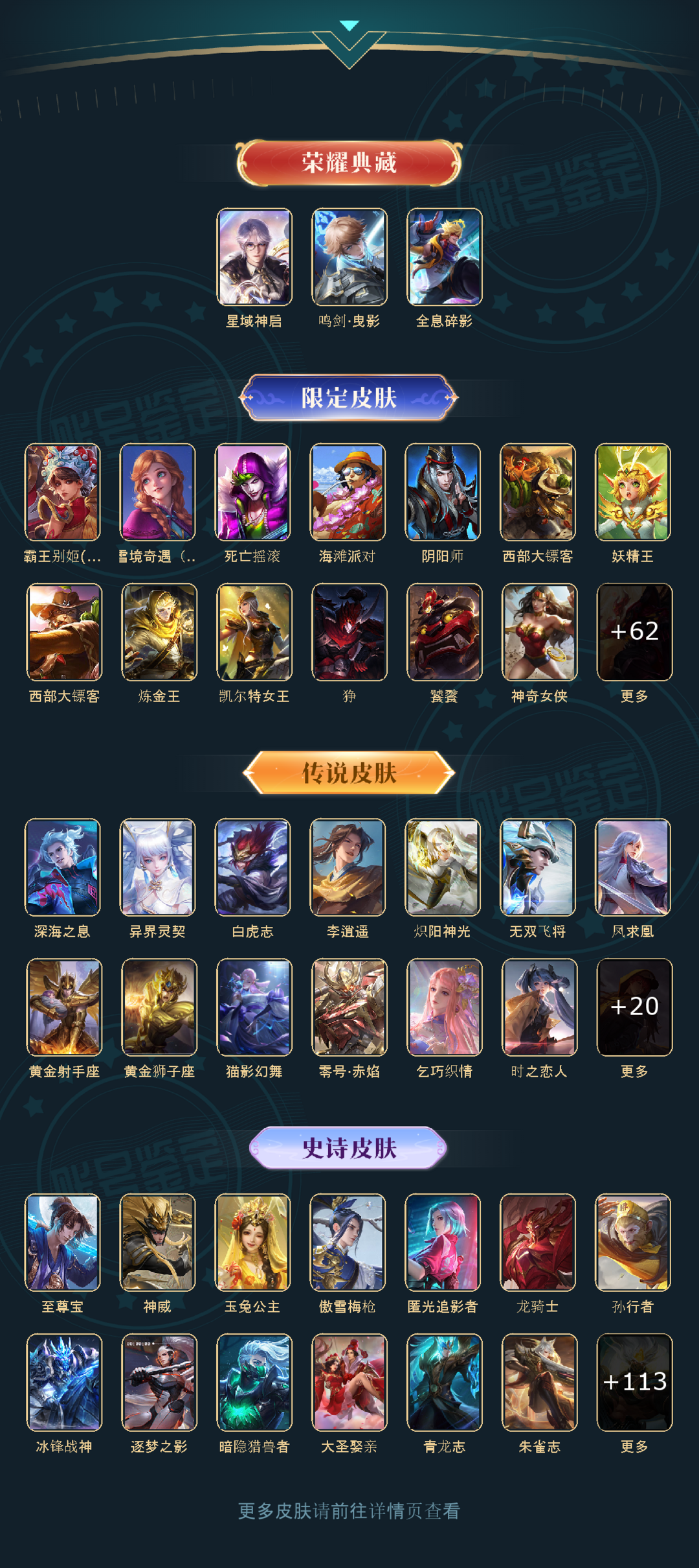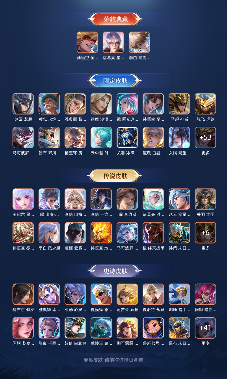 装备描述:: V10 英雄数: 126 皮肤数: 409 荣耀水晶: 鸣剑·曳影,全息碎影,星域神启 传说皮: 黄金狮子座,黄金射手座,绛天战甲,猫影幻舞,炽阳神光,一念神魔,云霓雀翎,地狱火,零号·赤焰,地狱之眼,李逍遥,乞巧织情,时之恋人-刘备,淬星耀世,超时空战士-狄仁杰,末日机甲-孙策,无双飞将,山海·炽霜斩,山海·苍雷引,艾琳觅芳踪 限定皮: 冰锋战神,遇见飞天,李小龙,游园惊梦,梁祝,御风骁将,时雨天司,龙胆,武圣,异界灵契,岱宗,天狼溯光者,虎魄,神威,天狼狩猎者,逐梦之影,神奇女侠,凤求凰,白虎志,青龙志,朱雀志,至尊宝,大圣娶亲,霸王别姬-虞姬,高山流水,孙行者,猪悟能,匿光追影者,傲雪梅枪,寅虎·心曲,时之祈愿-云中君,玉兔公主,深海之息,唐三藏,枫霜尽,匿光启智者,时之奇旅-妲己,星穹之声,五谷丰年,神器·万象笔,梦圆繁星,怒海麟威,齐天大圣