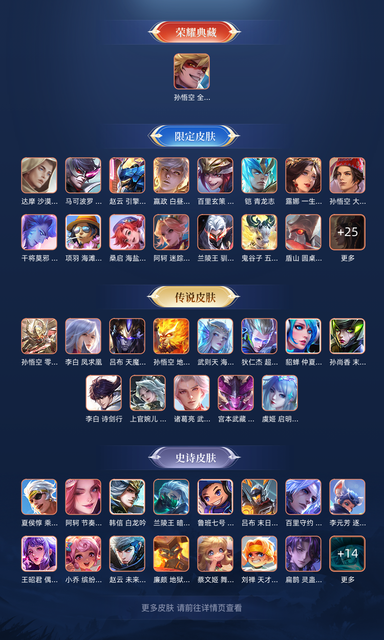 装备描述:荣耀水晶: 武则天,全息碎影 传说皮: 冠军飞将,炽阳神光,末日机甲-孙尚香,地狱火,仲夏夜之梦,零号·赤焰,海洋之心,地狱之眼,超时空战士-狄仁杰,艾琳觅芳踪 限定皮: 李小龙,梁祝,引擎之心,魔法小厨娘,天魔缭乱,冰霜恋舞曲,逐梦之影,凤求凰,白虎志,青龙志,一生所爱,武陵仙君,大圣娶亲,五谷丰年,神器·万象笔,诗剑行