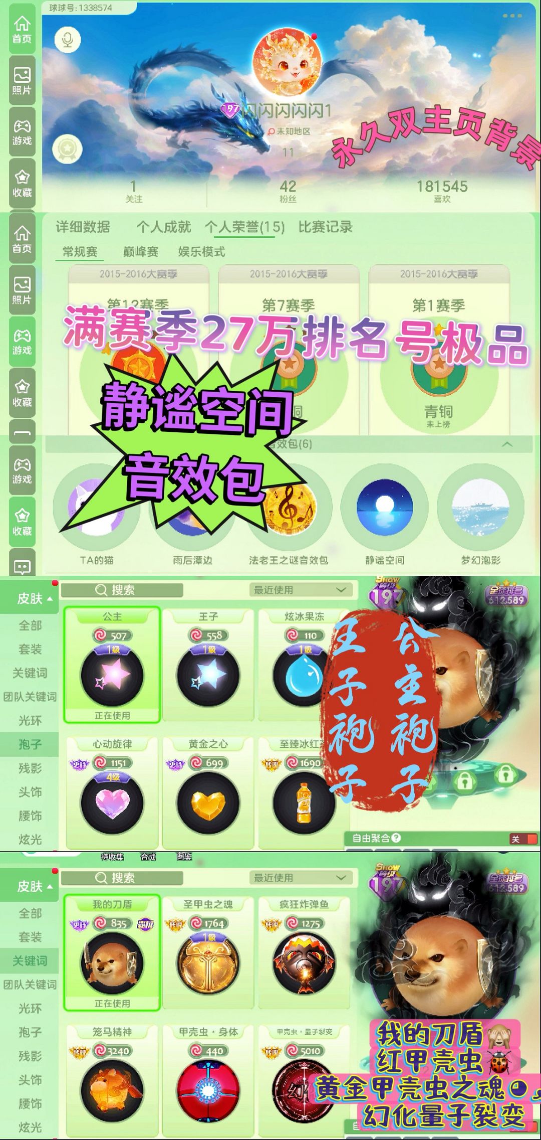 静谧空间*满赛季1.2万排名静谧/我的刀盾/王子公主袍子老版本的/幻化量子/红甲壳虫/黄金甲壳虫之魂