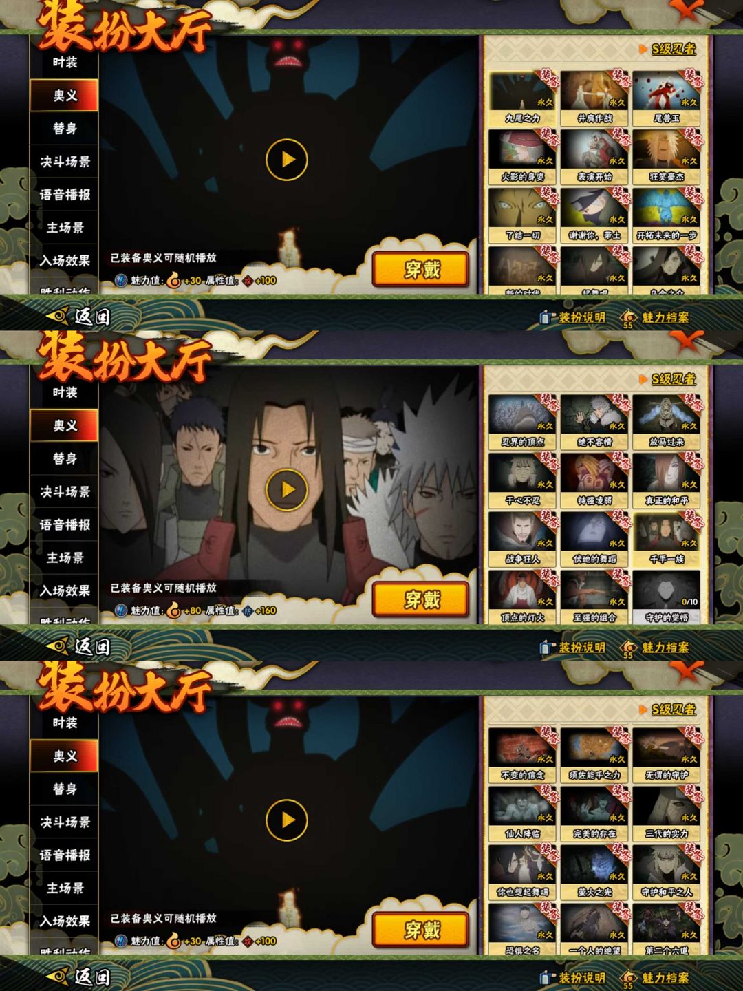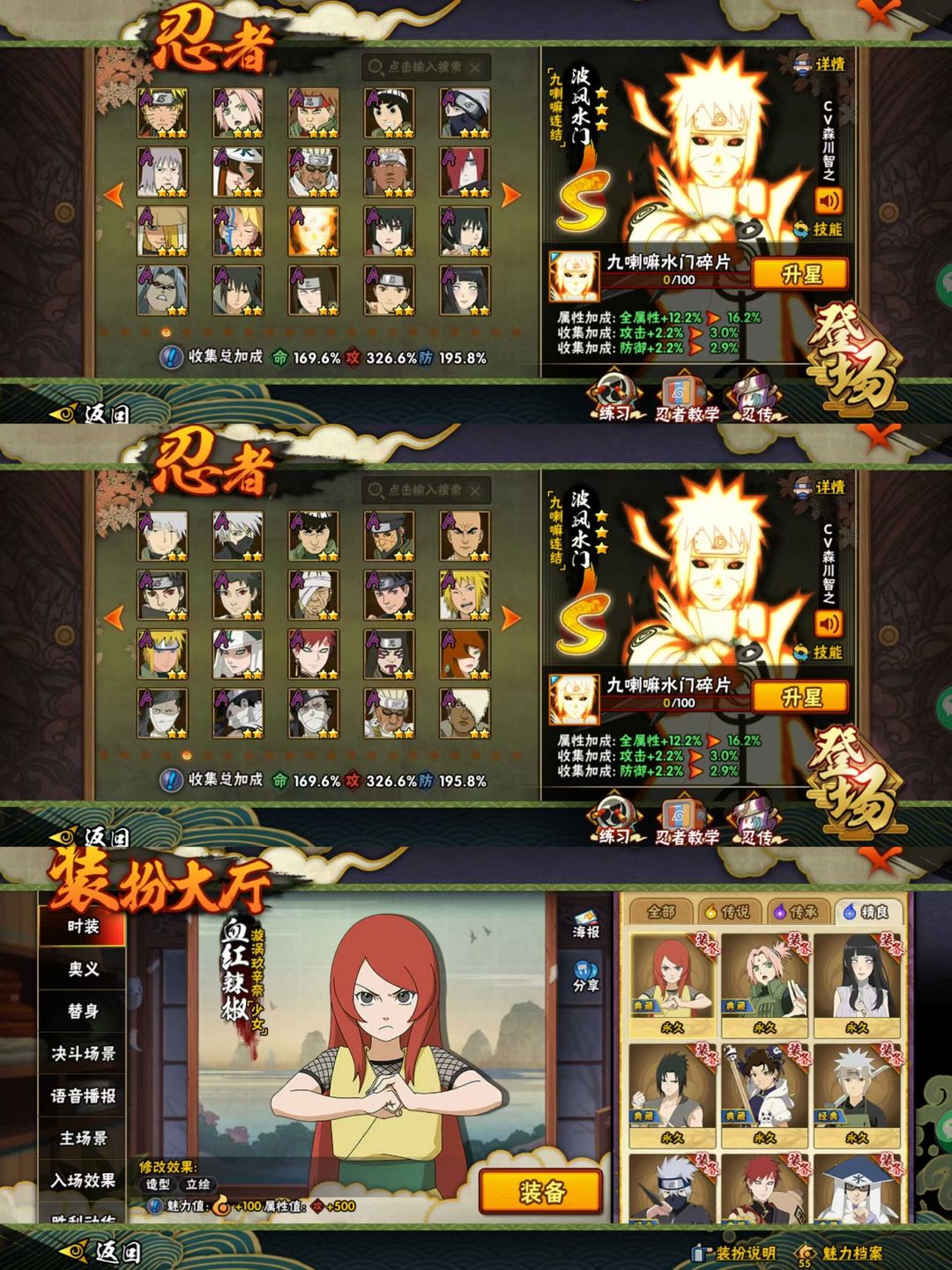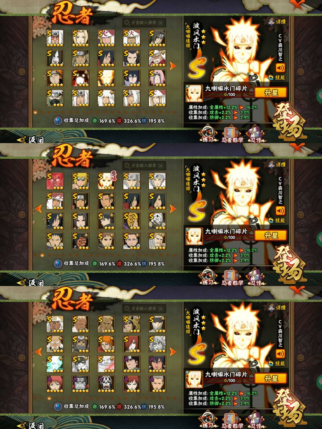 装备描述:42S忍 木叶班✨秽土水门✨白面具✨三代猿飞日斩✨秽土鼬✨秽土斑✨自来也✨大蛇丸✨秽土长门✨仙人自来也✨仙人兜✨无✨二代千手扉间✨三代雷影艾✨秽土半藏✨天道佩恩✨百豪纲手✨千手柱间初代✨佩恩超天道超✨水门✨金角银角✨须佐鼬✨纲手✨秽土二代✨鬼灯幻月✨斑✨豪杰自来也✨秽土三代 喜欢的点个收藏ヾ^。^* 多多来个好评 小弟在这里祝大家玩得开心。✪ω✪ 登入不上的 看一下游戏是否更新到最新版本,自己游戏号退出了没。 确实无法登入