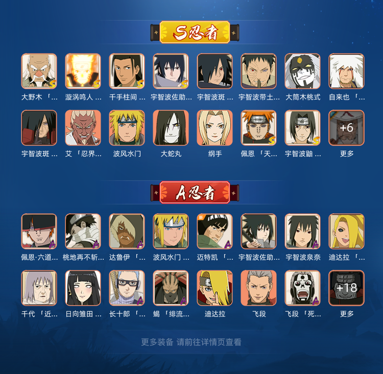 装备描述:20S 26A 171忍者 佩恩·六道 「漂泊浪客」/神秘面具男 「红夜之刃」/宇智波斑 「秽土转生·解」/千手柱间 「木叶创立」/漩涡鸣人 「九喇嘛连结」/宇智波带土「忍界大战」/宇智波佐助 「永恒万花筒」/大筒木桃式