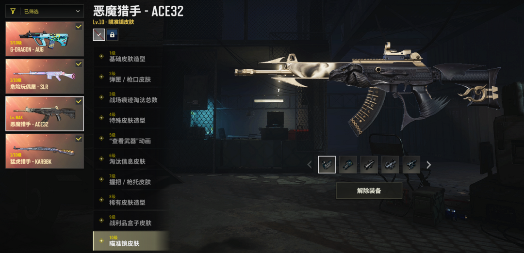 ⑩级恶魔ACE✅③权志龙AUG✅玩偶大炮✅猛虎98K✅白虎锅✅白战神✅绿东拉风龙