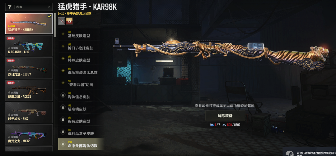 ⑤级猛虎猎手98K✅青花之力M7①级无信号M4✅①级魔咒之力MK12✅黄道猎手M4✅黄金齿轮M762