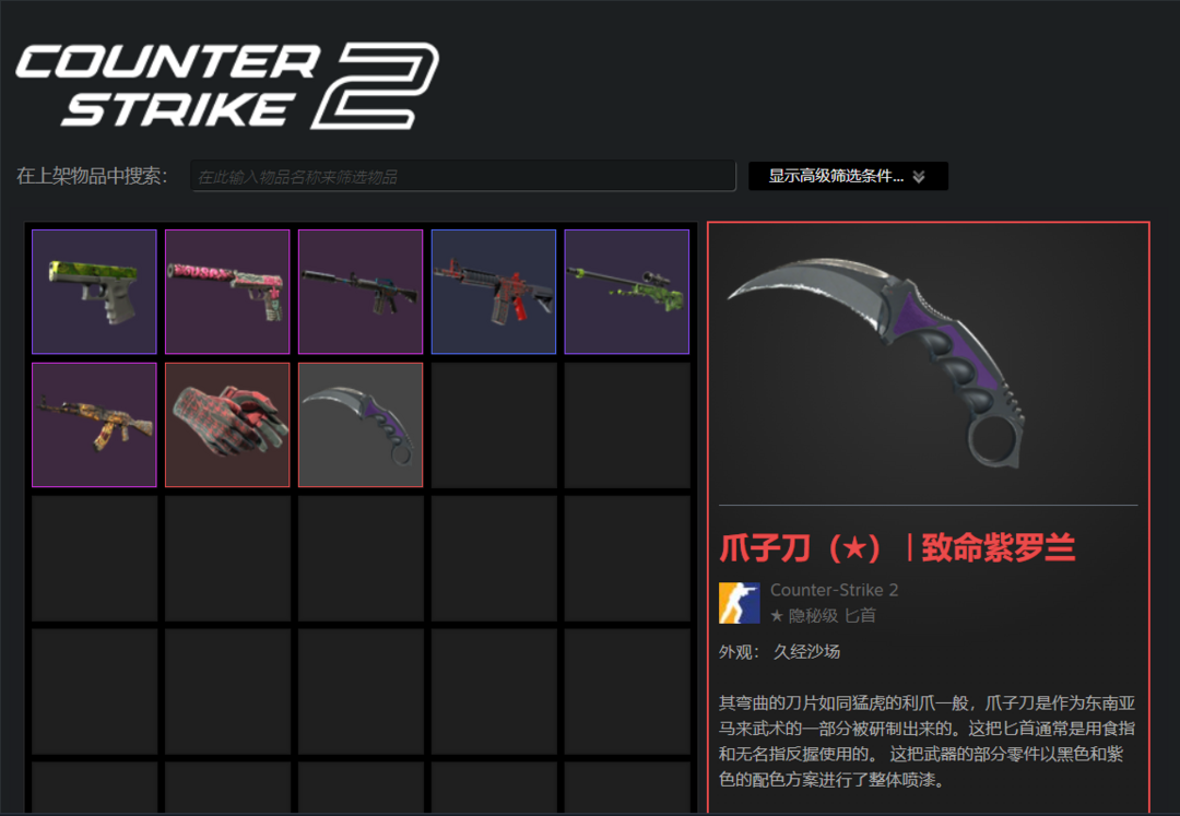 完美C+⭐爪子刀-致命紫罗兰⭐运动手套-猩红头巾⭐灼心怒焰AK⭐响尾蛇AWP⭐控制台M4A1