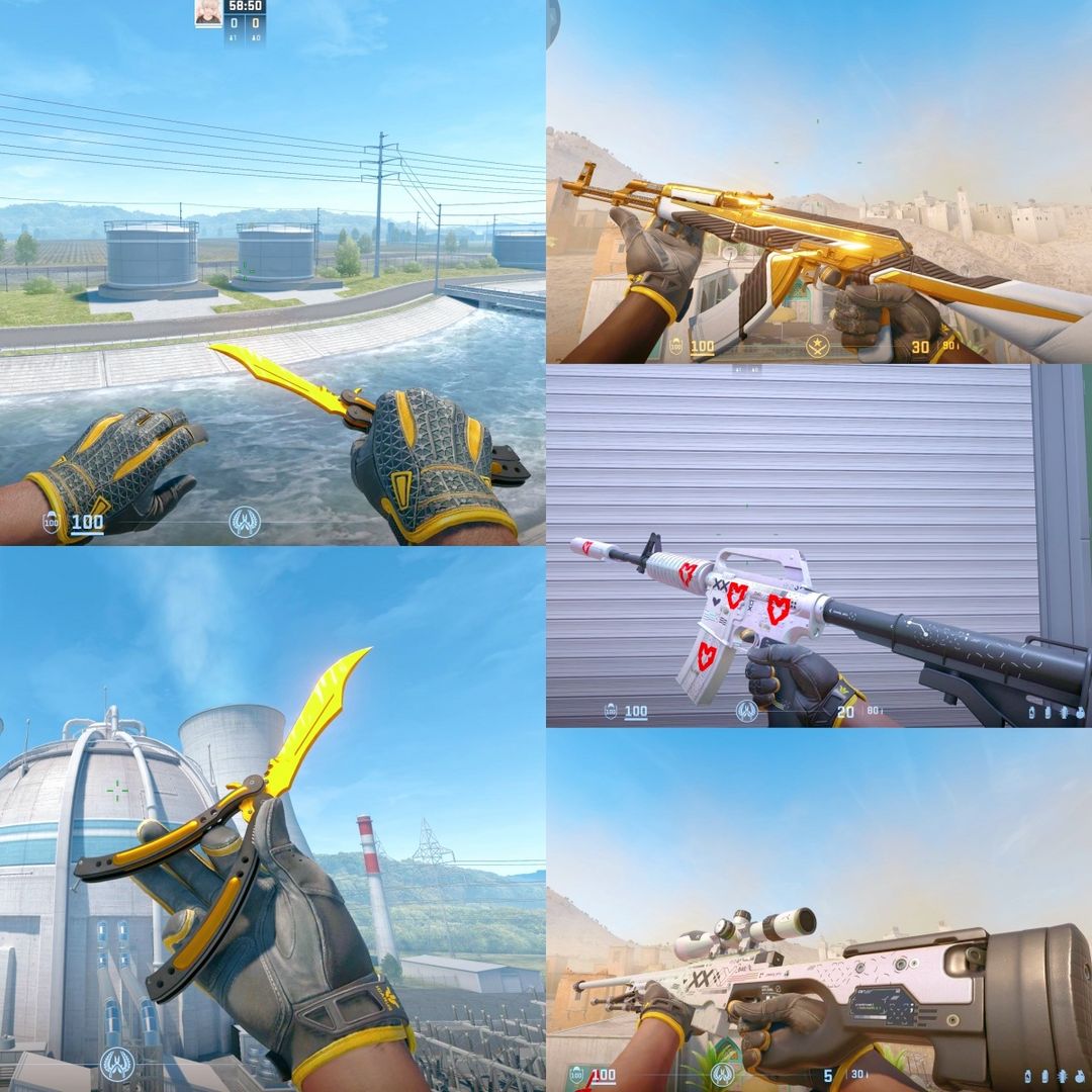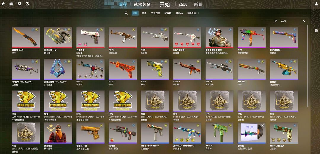 完美新手可5E✅黄金虎牙蝴蝶刀✅欧米伽手套✅金光四联流金王朝AK47✅印花集全套✅枪皮全