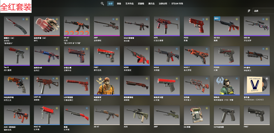 完美B+❤全红套装❤蝴蝶刀自动化❤弹弓手套❤红线AK47❤金粉肆蛇AWP❤变频器M4A4
