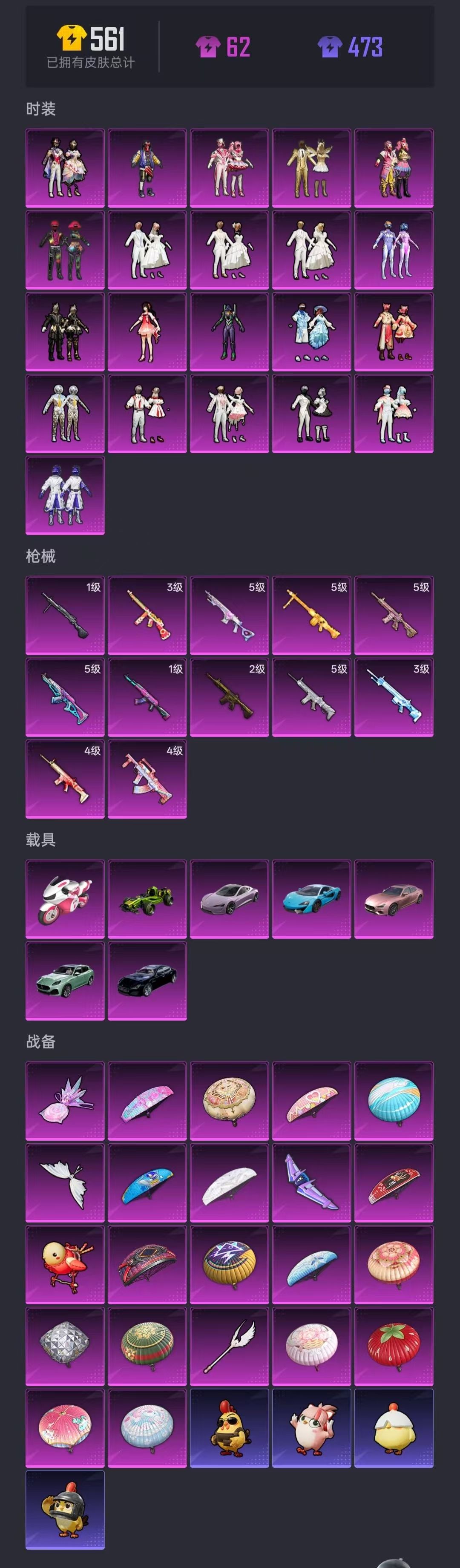 限制: 租号5次及以上 | 撤单率<49%才可租用此帐号装备描述:禁止开挂,禁止坐挂车,禁止骂人,禁止分解枪械等~谢谢宝宝们~ 套装118个,粉套21个, 枪皮143个,特效枪12个 载具皮肤7个 装备197个,三级头27个,三级包29个 滑翔尾迹6个,伙伴4个,动作38个 祝您游戏愉快~