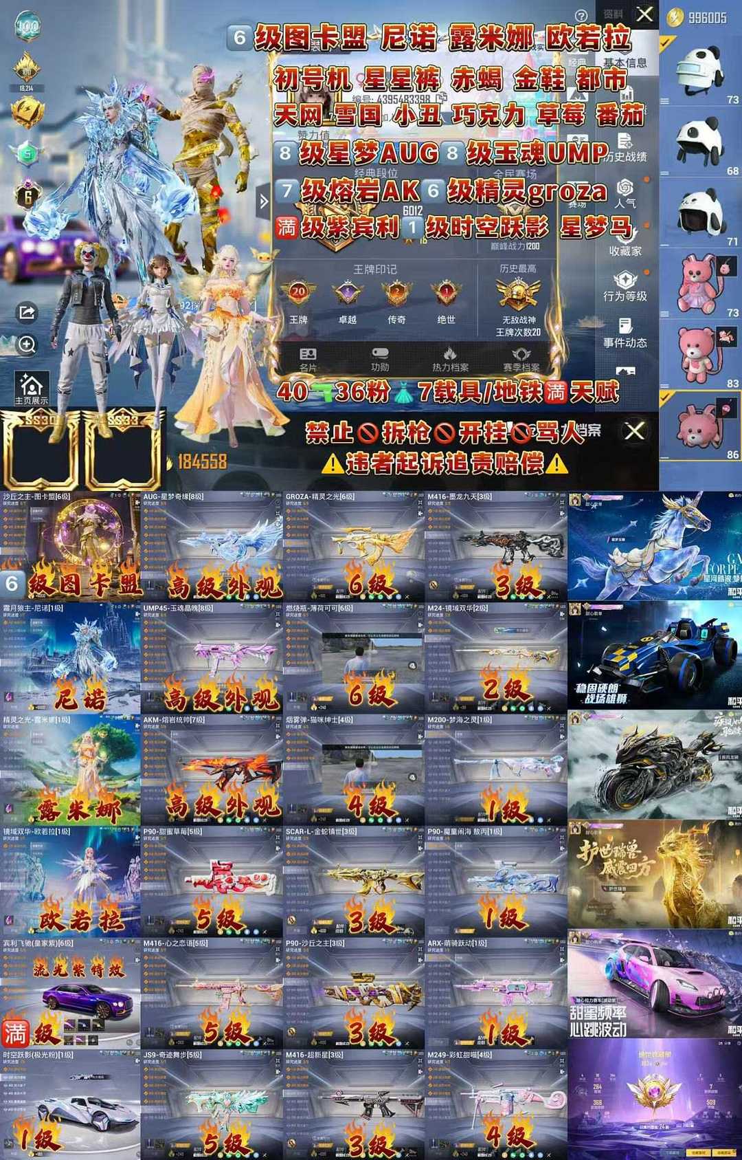 限制: 租号8次及以上 | 撤单率<60%才可租用此帐号装备描述:特别声明!!!! 分解枪械永久拉黑不解除 【乱投诉拉黑】有问题/上不去/其他问题/ 特殊需求/投诉没用等问题 账号累计充值超20万!切勿开挂/分解装备/恶意骂人/等等违规行为,发现违规必追查到底(平台登录记录,游戏登录ip手机号 设备串号 充值付款记录不要侥幸现在网警都能调到你的所有行为记录就算盗用他人信息也一样能查到你头上)按账号充值金额=起诉/刑事立案/追责赔偿! 非速玩【非云!本机设备畅玩不卡顿】