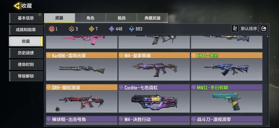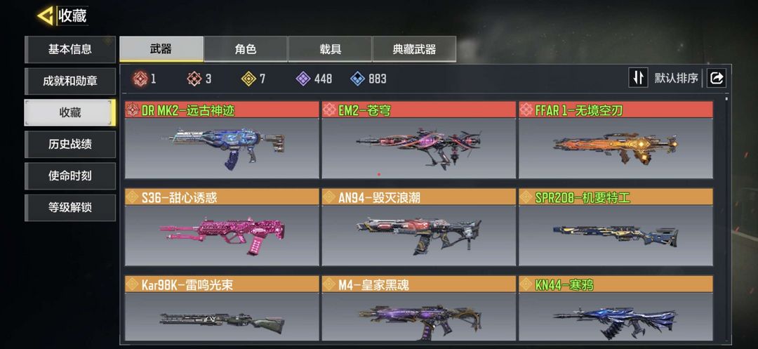 装备描述:神话级五级皮肤DR-MK2 448个紫皮883个蓝皮钻 皮spr 208 机要特工(几乎每把枪都有皮肤) 139个 紫色人物皮肤45个蓝色人物皮肤 20年S1 S2 战神22年s1 s2 s3 s4 s5 神话23年s1 s2 s3 s4 s5 神话
