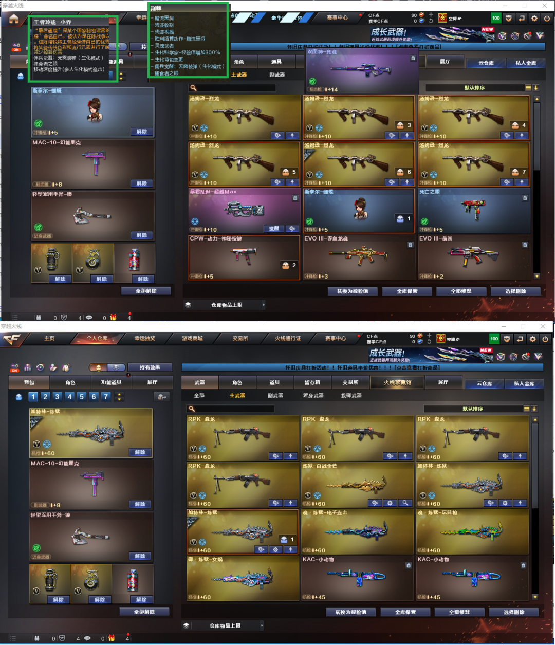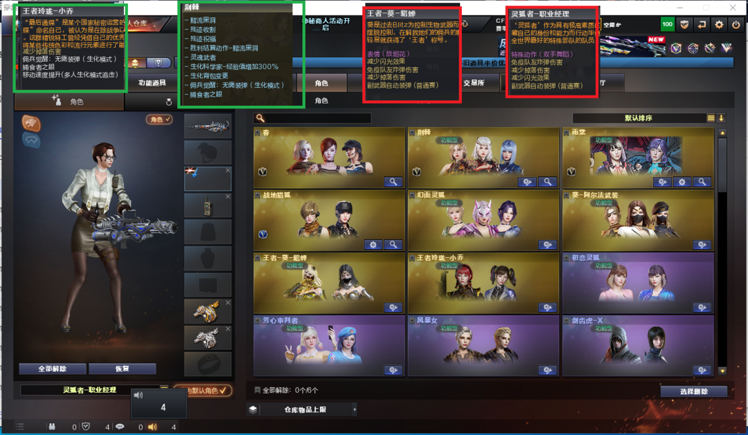 装备描述:排位:可以、、、、、、、、、爆破四防:幻神2皮+音效(24AG冠军、冠军之幻皮肤)、USP雷暴、USP冥王、世冠柯尔特、白虎、QBZ金色蔷薇、、、幻神音效、裁决音效、毁灭音效、火麒麟音效、黑骑士音效、7套雷暴、1套堕天神、、、爆破四防(荆棘、雨棠、王者貂蝉、职业经理)