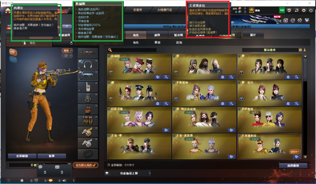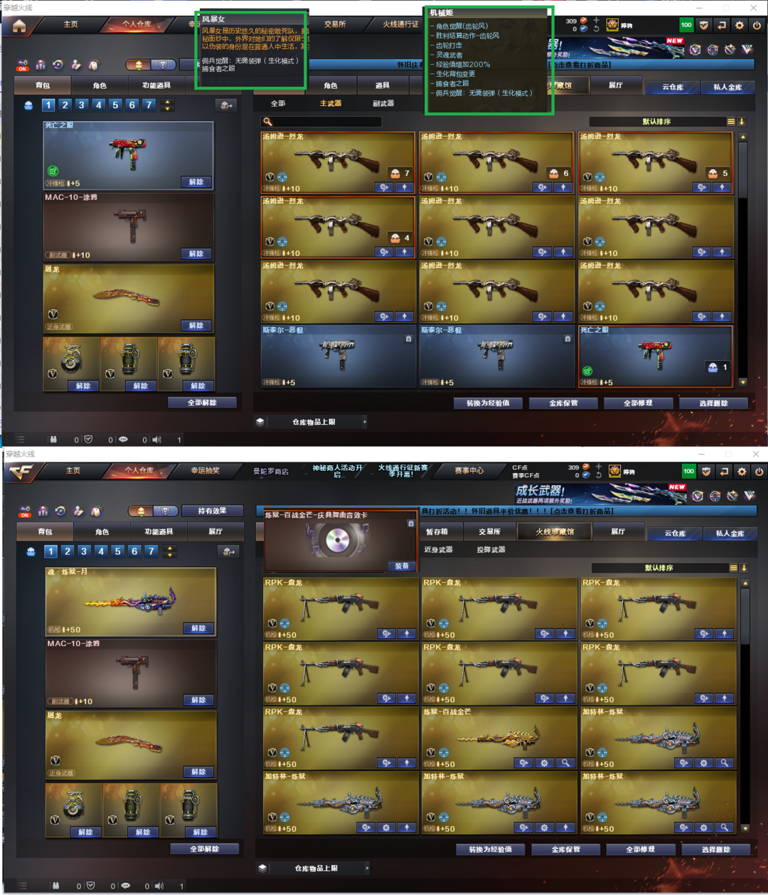 装备描述:排位:可以、、、、、、、生化全装(查看生化僵尸血量):无需换弹、6烈龙、6盘龙、6炼狱、死亡之眼、MAC涂鸦、手斧镜、超级对讲机、、、、、、、、、、爆破四防:裁决音效卡(带皮肤)、USP雷暴、2个USP冥王、G36幻影、加利尔ACE天袭、传说圣谕、FAMAS G2-天戎、王者凌虎、白虎、QBZ蔷薇、、、裁决音效、炼狱音效、黑骑士音效、、、1套雷暴、4套玄豹、、、生化人物(风暴女)爆破四防(王者潘多拉、机械姬、王者迷迭香)