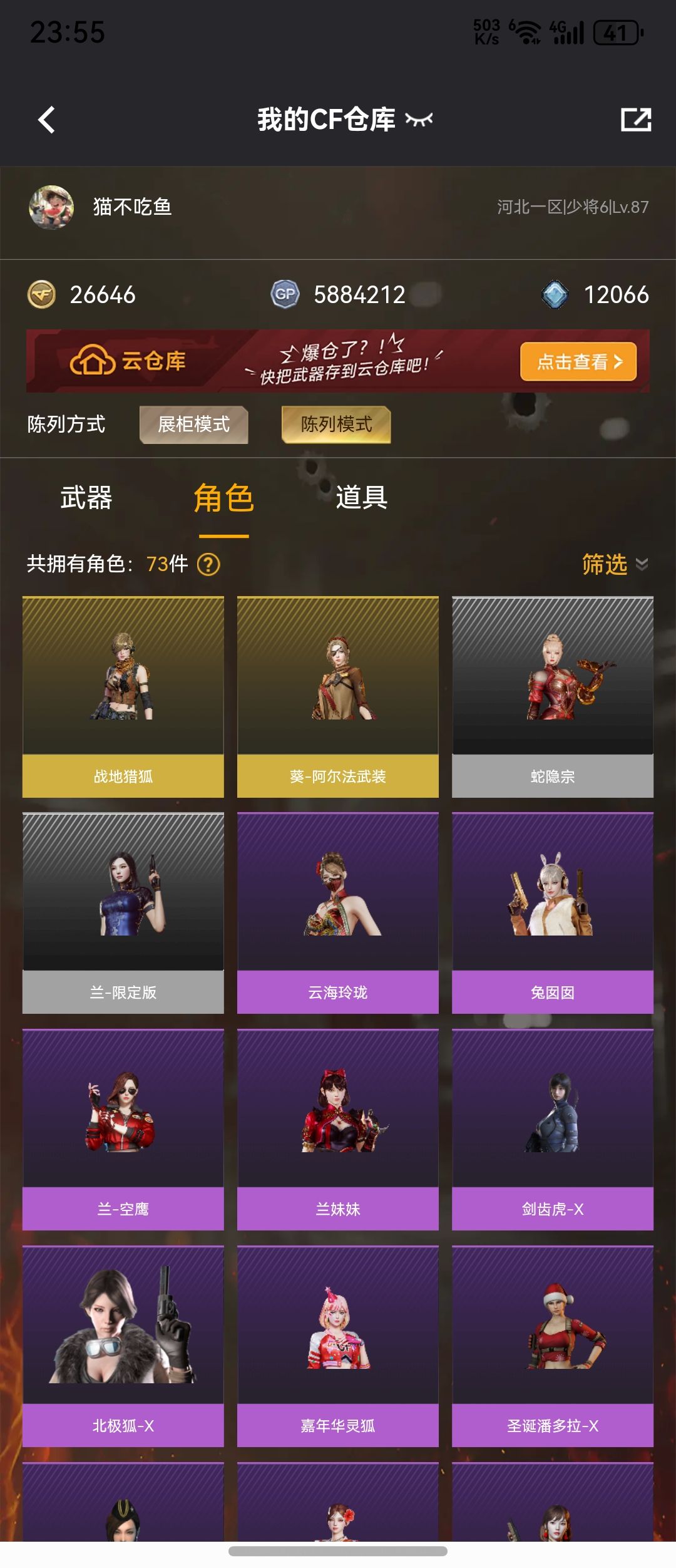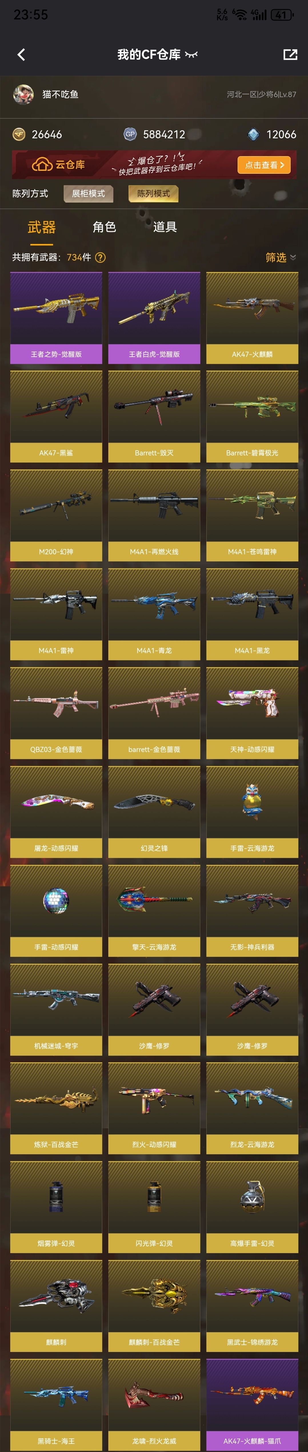 限制: 租号1次及以上 |装备描述:王者武器:王者之势-觉醒版;王者白虎-觉醒版 英雄武器:Barrett-碧霄极光;机械迷城-穹宇;M4A1-雷神;麒麟刺;超新星-热带奇洋;龙啸-热带奇洋;黑武士-锦绣游龙;手雷-热带奇洋;M4A1-黑龙;沙鹰-修罗;黑骑士-海王;烈龙-云海游龙;擎天-云海游龙;手雷-云海游龙;QBZ03-金色蔷薇;AK47-黑鲨;M200-幻神;M4A1-青龙;幻灵之锋;高爆手雷-幻灵;烟雾弹-幻灵;闪光弹-幻灵;龙啸-烈火龙威;Barrett-毁灭;烈火-动感闪耀;屠龙-动感闪耀;天神-动感闪耀;手雷-动感闪耀;无影-神兵利器;AK47-火麒麟 角色:猎狐者;飞虎队;刀锋;幻影;复仇者;堕天使;活力灵狐;夜玫瑰;威锋;猎狐者-英特尔;娜塔莎;救世复仇;精英部队;烈锋;新娜塔莎;雷豹;蜀雪;潜龙队-X;剑齿虎;北极狐-X;陈龙野-Z;青霞仙子;妲己;娟娟;紫霞;灵狐者-职业经理;夜玫瑰-X;麻雀;剑齿虎-X;圣诞潘多拉-X;虎妞;代号:翼;曼陀罗-礼服;兔囡囡;毒蝎-X;风暴女;木兰;嘉年华灵狐;猎狐者-追月;电竞少女;兰-限定版;游珑儿;狐妖儿;秦师;猎狐者-X 道具:步枪弹匣;手枪弹匣;灵魂忍者